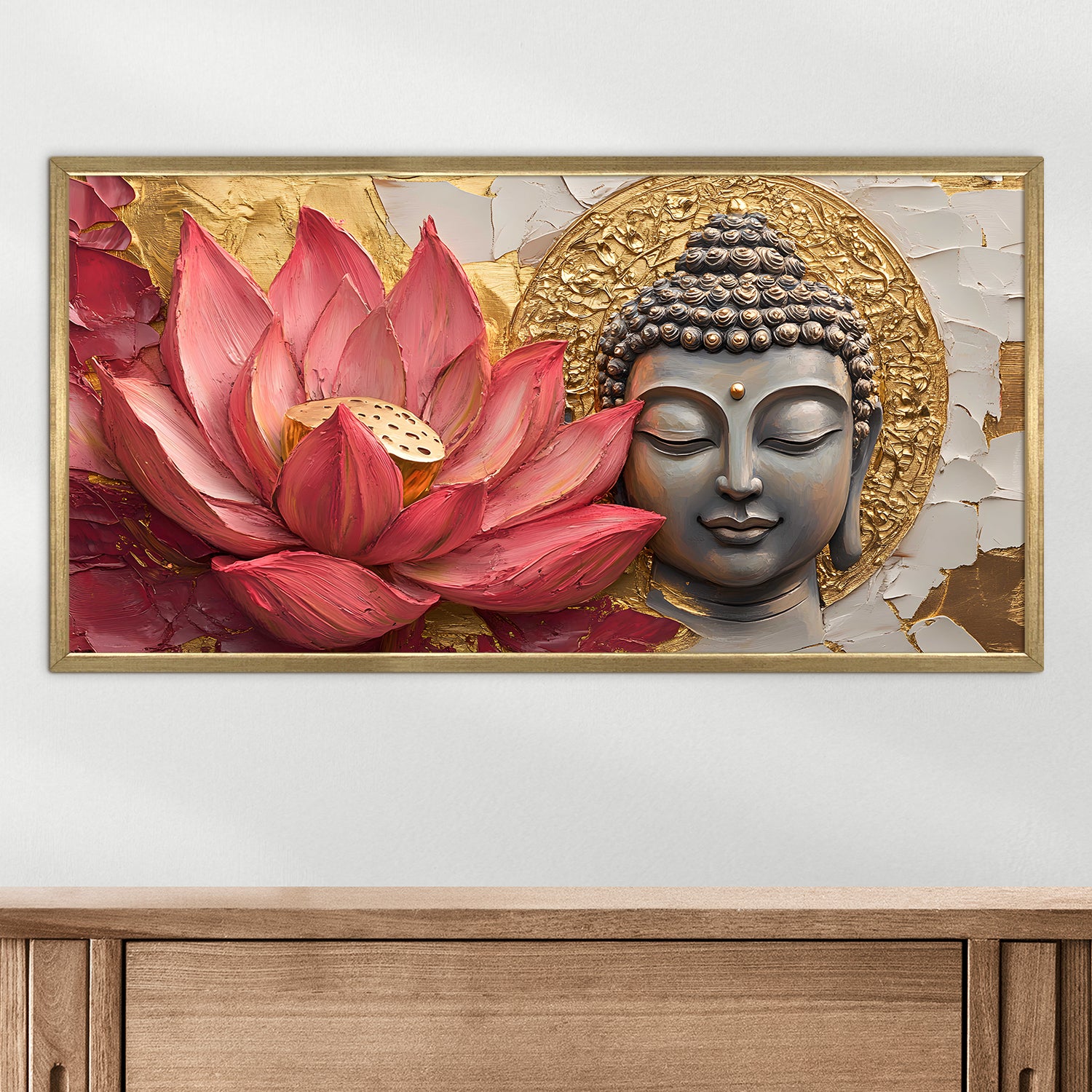 Buddha with Red Lotus Wall Art, HD Canvas Print, Golden Box Framed, Ready to Hang, (24 In x 48 In) (BUDDHA-WA-09)