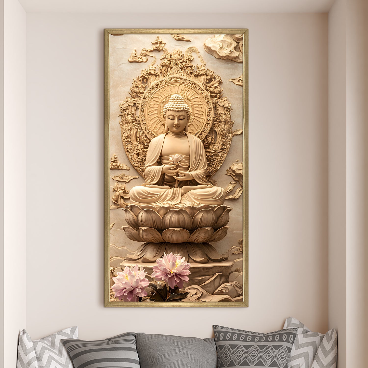 - Serene Buddha Artwork: Elegant Buddha painting surrounded by lotus flowers, symbolizing peace, harmony & positivity for home and meditation decor.