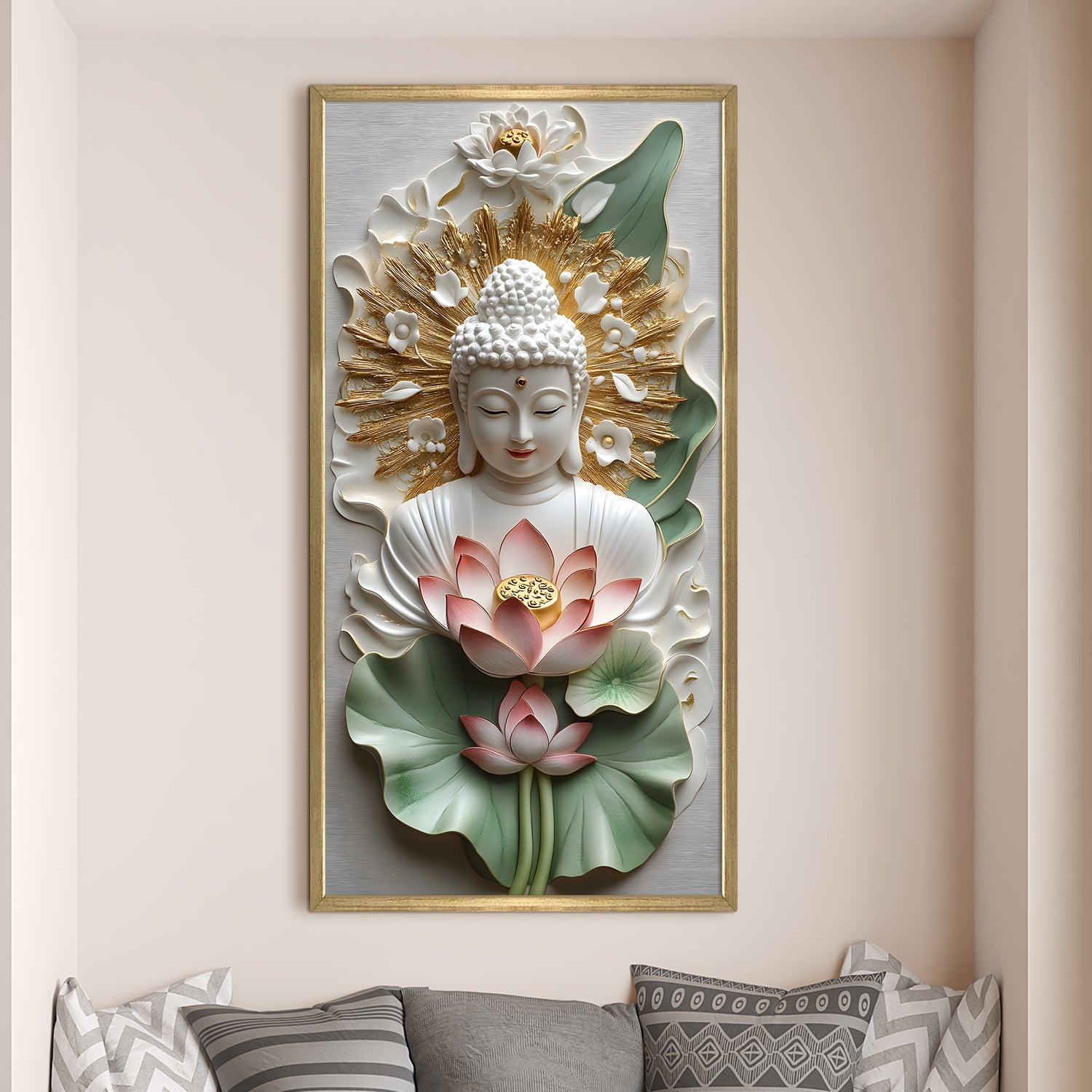 - Serene Buddha Artwork: Elegant Buddha painting surrounded by lotus flowers, symbolizing peace, harmony & positivity for home and meditation decor.