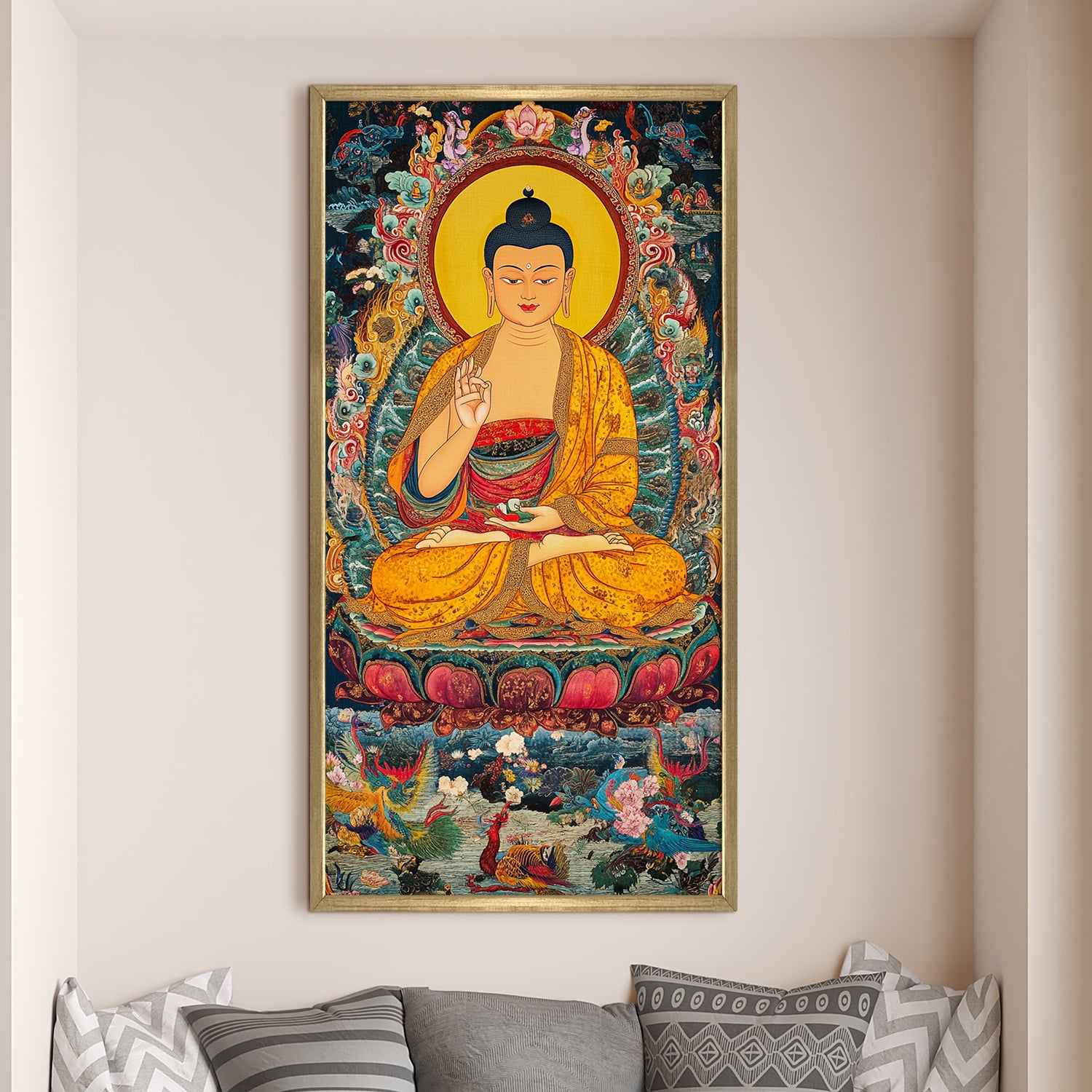 - Serene Buddha Artwork: Elegant Buddha painting surrounded by lotus flowers, symbolizing peace, harmony & positivity for home and meditation decor.