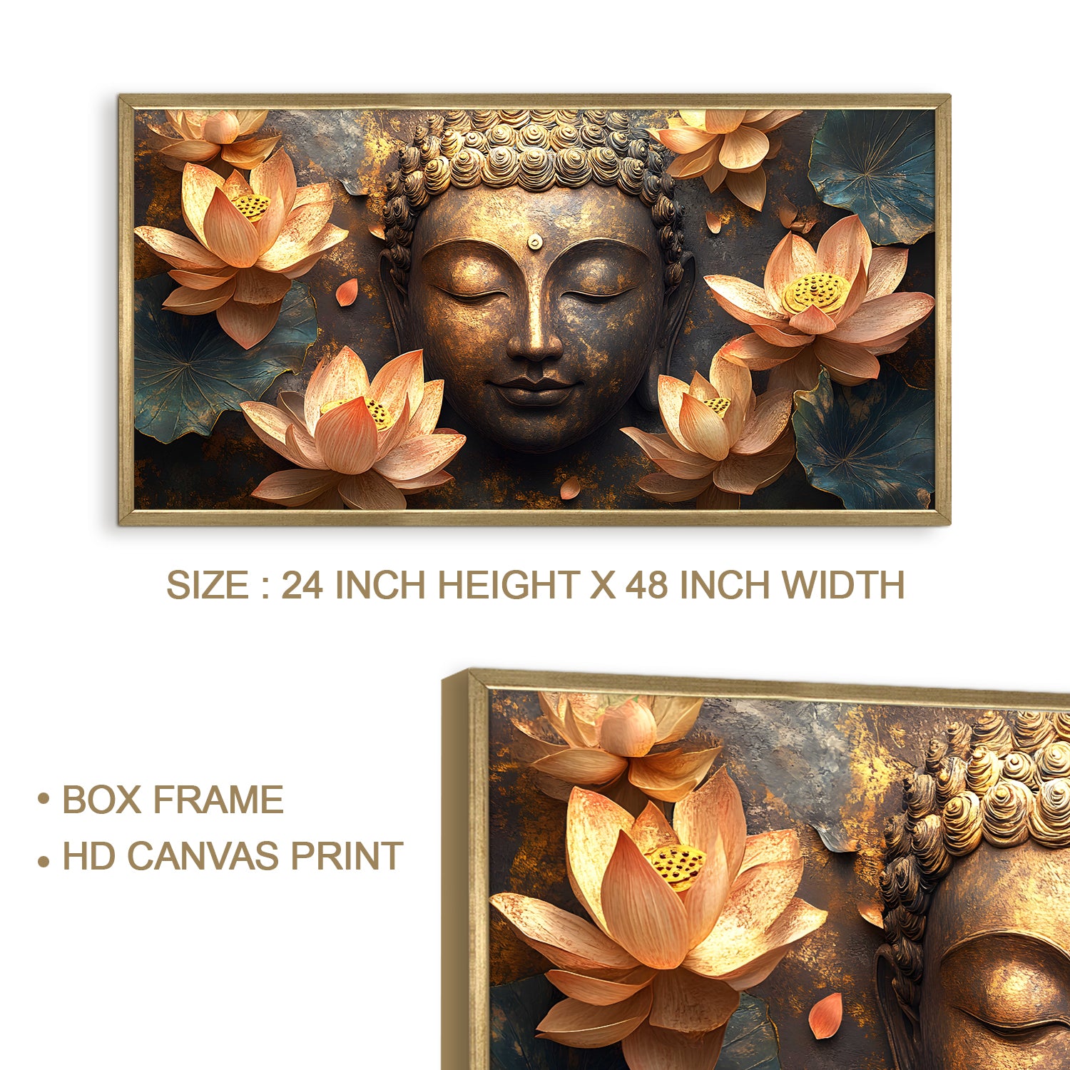 Golden Buddha with Lotus Wall Art, HD Canvas Print, Golden Box Framed, Ready to Hang, (24 In x 48 In) (BUDDHA-WA-20)