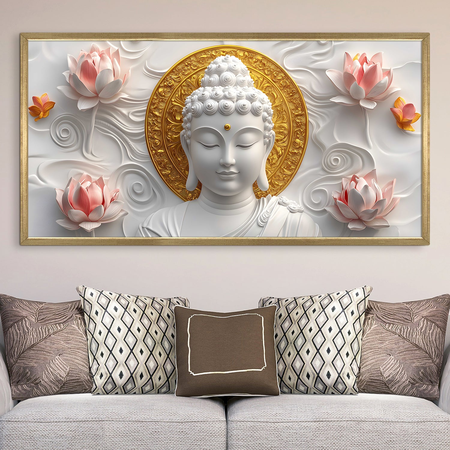 - Serene Buddha Artwork: Elegant Buddha painting surrounded by lotus flowers, symbolizing peace, harmony & positivity for home and meditation decor.