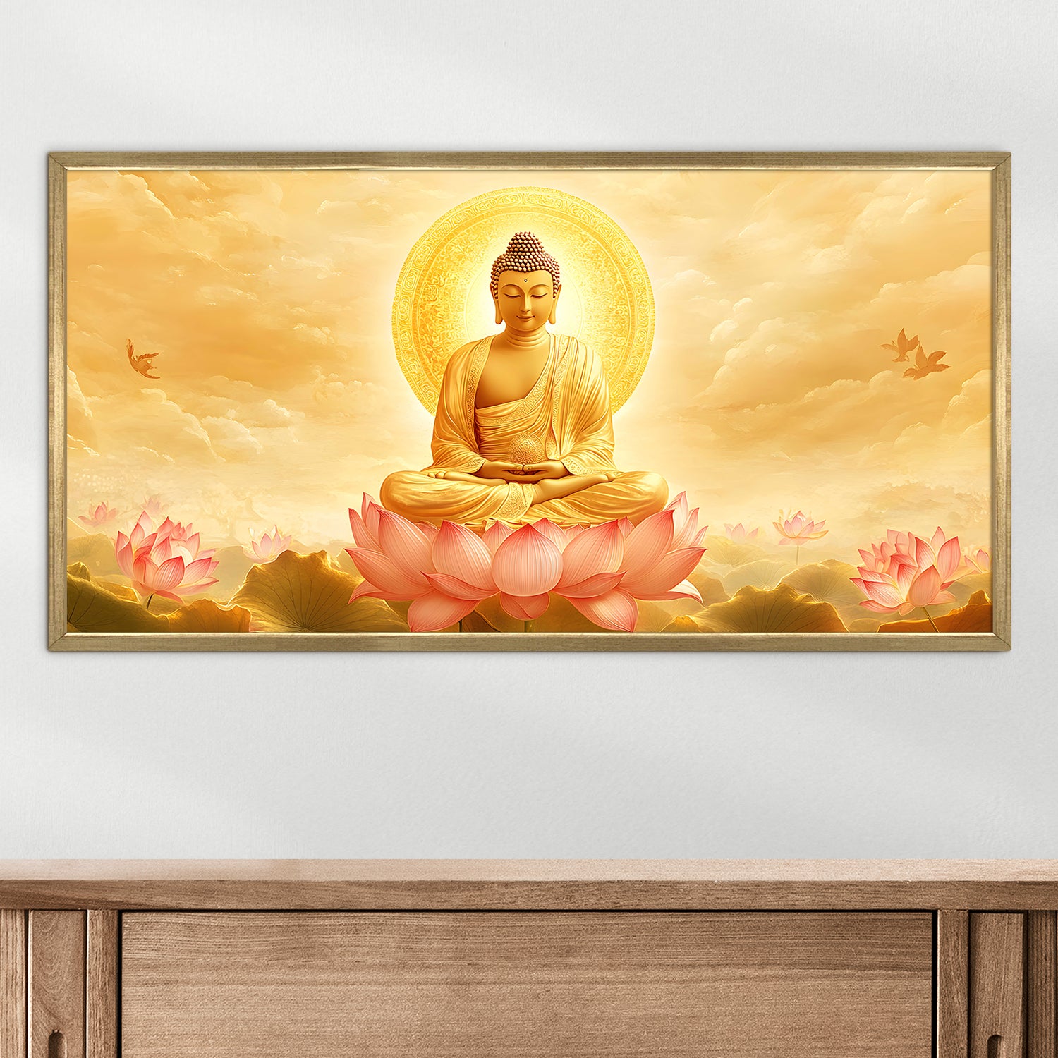 - Serene Buddha Artwork: Elegant Buddha painting surrounded by lotus flowers, symbolizing peace, harmony & positivity for home and meditation decor.