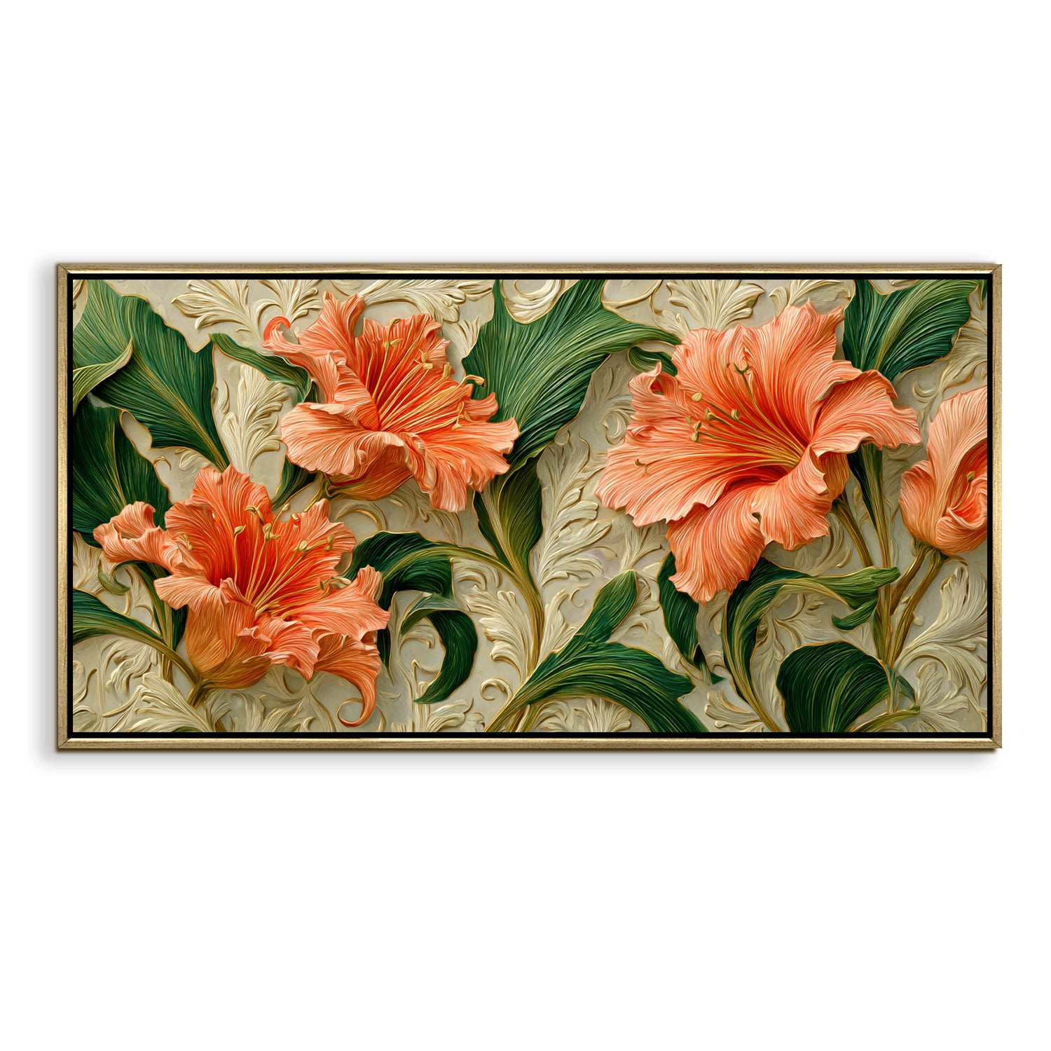 Coral Blooms & Green Leaves Wall Art – Golden Floater Frame, HD Canvas Print, Ready to Hang, Size: 2x4 feet (FLBWA96)