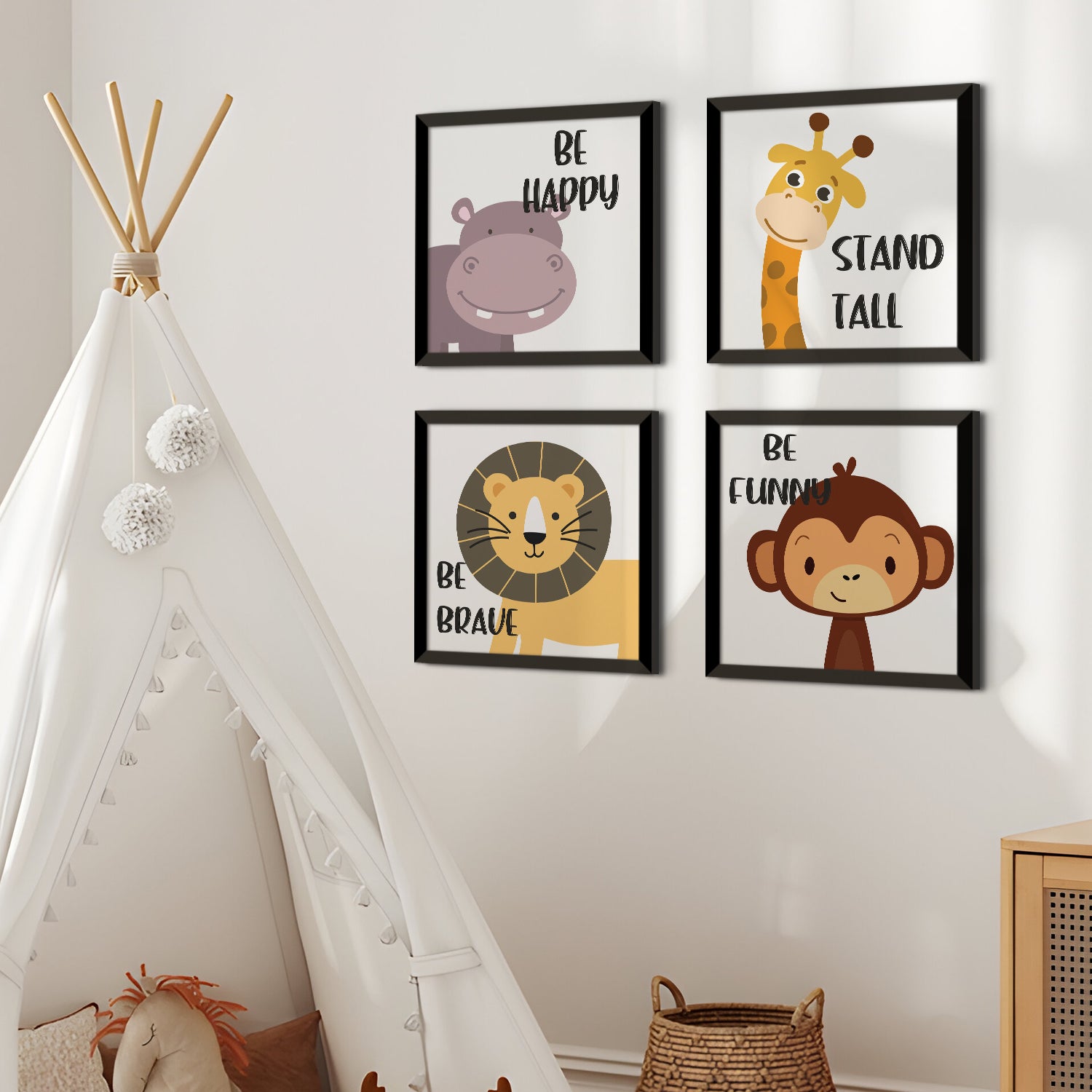 Kids Wall Art Set of 4 | HD Canvas Print | Ready to Hang | Black Framed Kids Room & Nursery Room Decor | Each Frame Size: 10X10 INCH (KIDSET02)