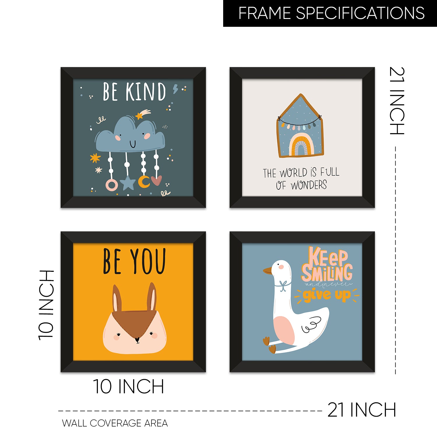 Kids Wall Art Set of 4 | HD Canvas Print | Ready to Hang | Black Framed Kids Room & Nursery Room Decor | Each Frame Size: 10X10 INCH (KIDSET06)