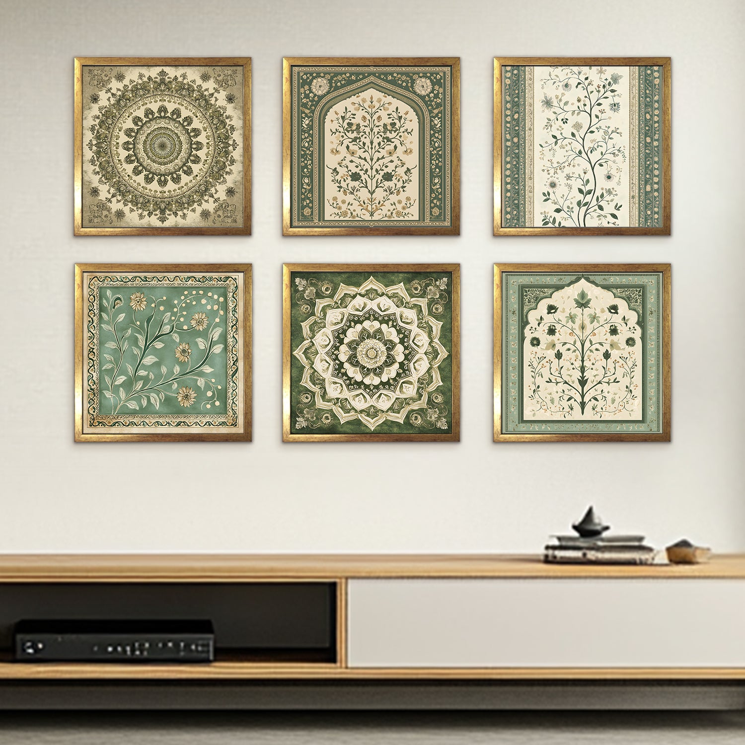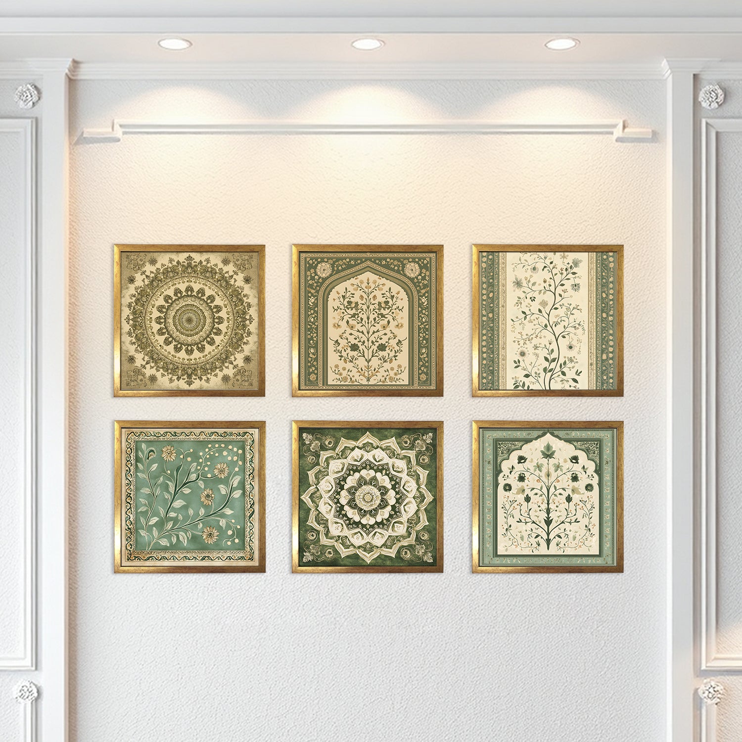 Ethnic Wall Art Set of 6 | HD Canvas Print | Ready to Hang | Golden Box Frame Panels for Home & Office Décor | Each Frame Size: 14X14 INCH (ETHF05)