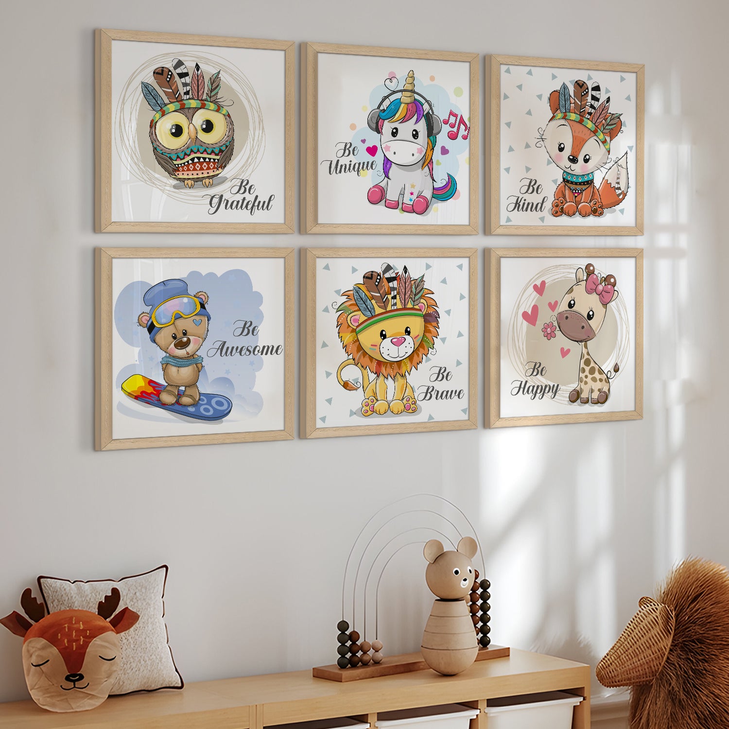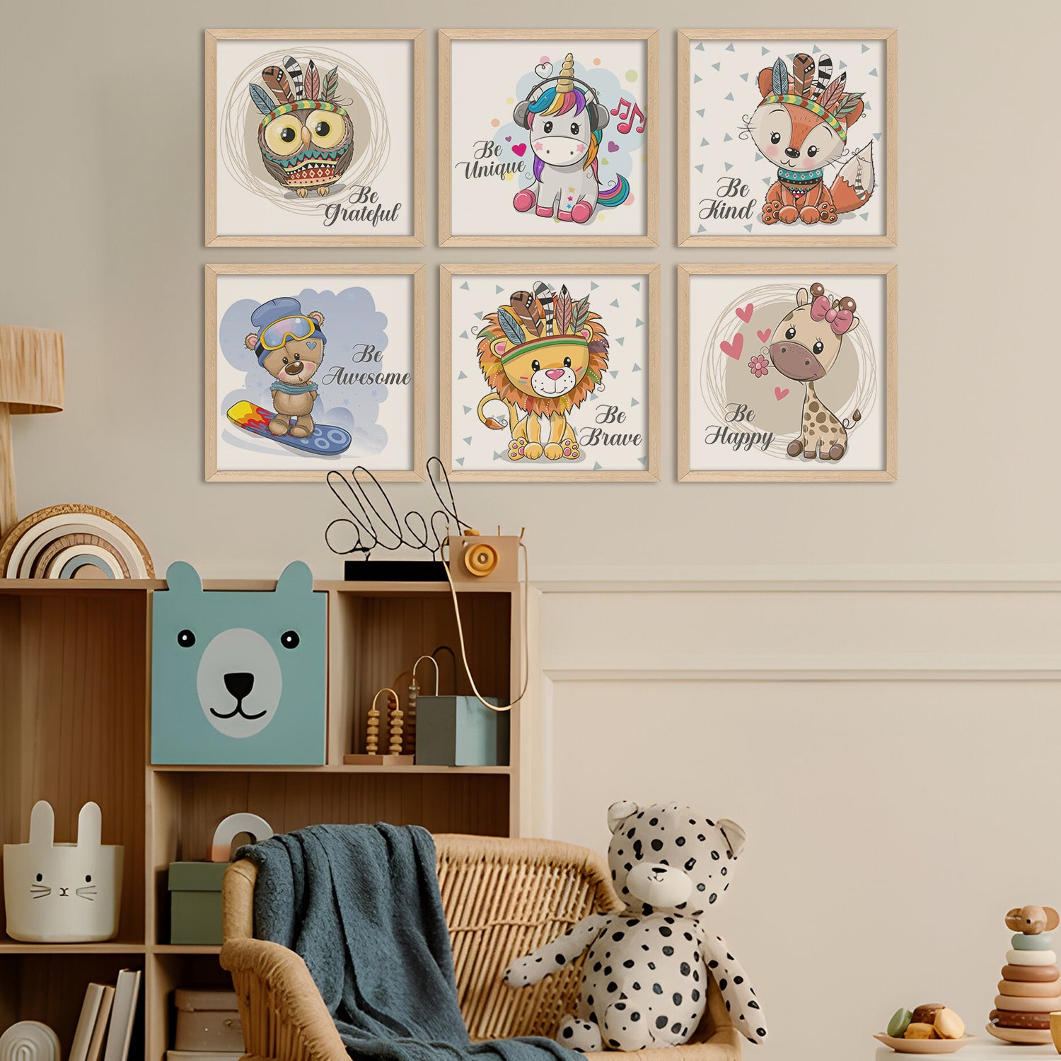 Kids Wall Art Set of 6 | HD Canvas Print | Ready to Hang | Natural Wood Panels for Nursery & Kids Room Decor | Each Frame Size: 10X10 INCH (KIDSET01)