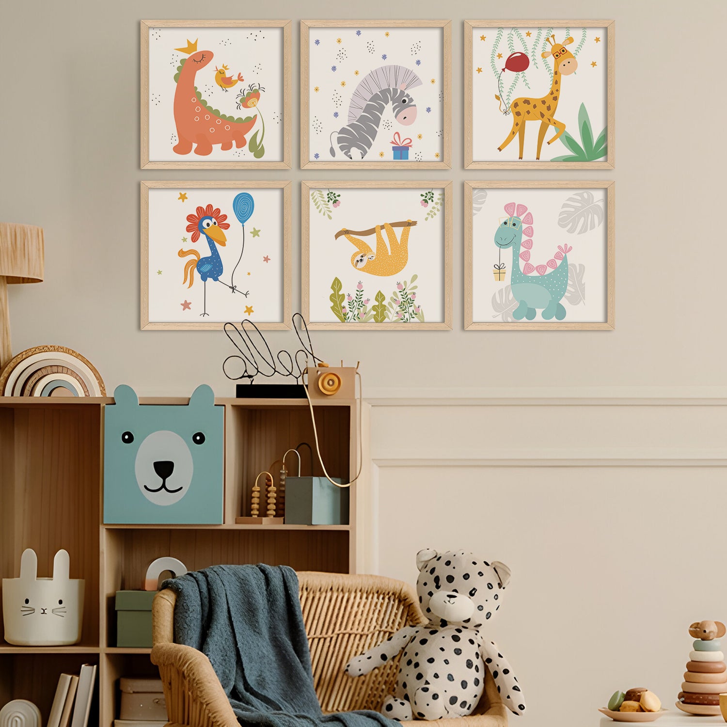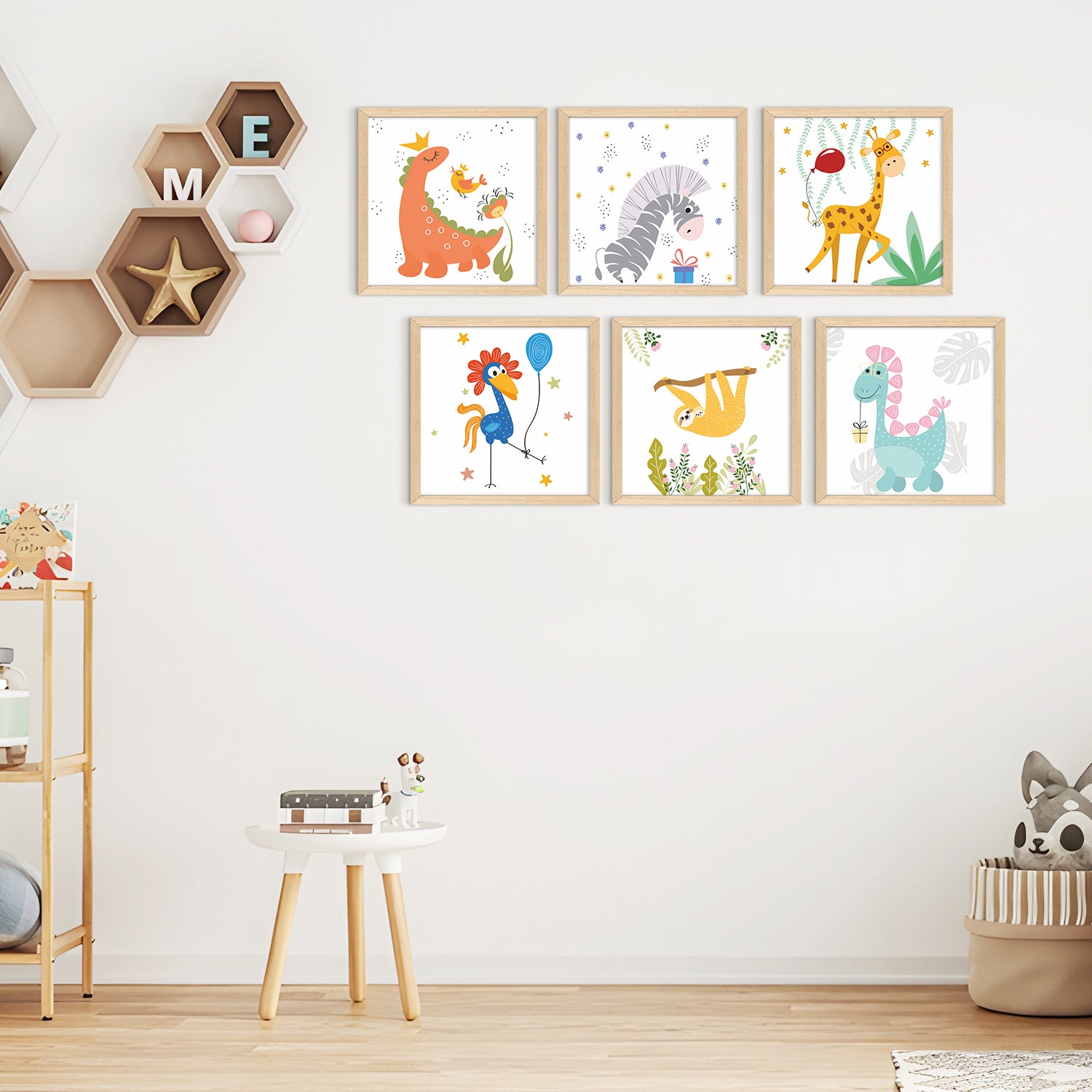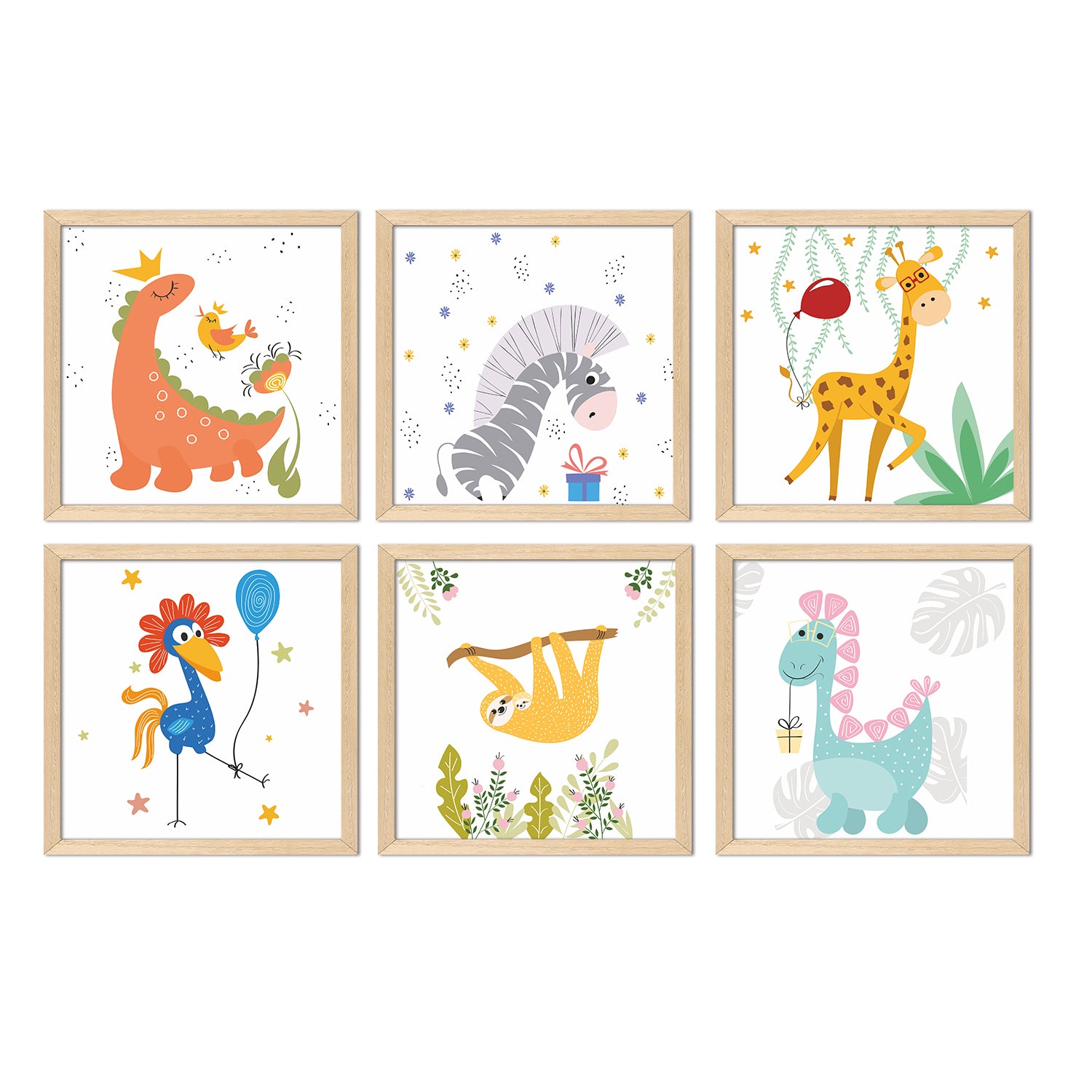Kids Wall Art Set of 6 | HD Canvas Print | Ready to Hang | Natural Wood Panels for Nursery & Kids Room Decor | Each Frame Size: 10X10 INCH (KIDSET03)