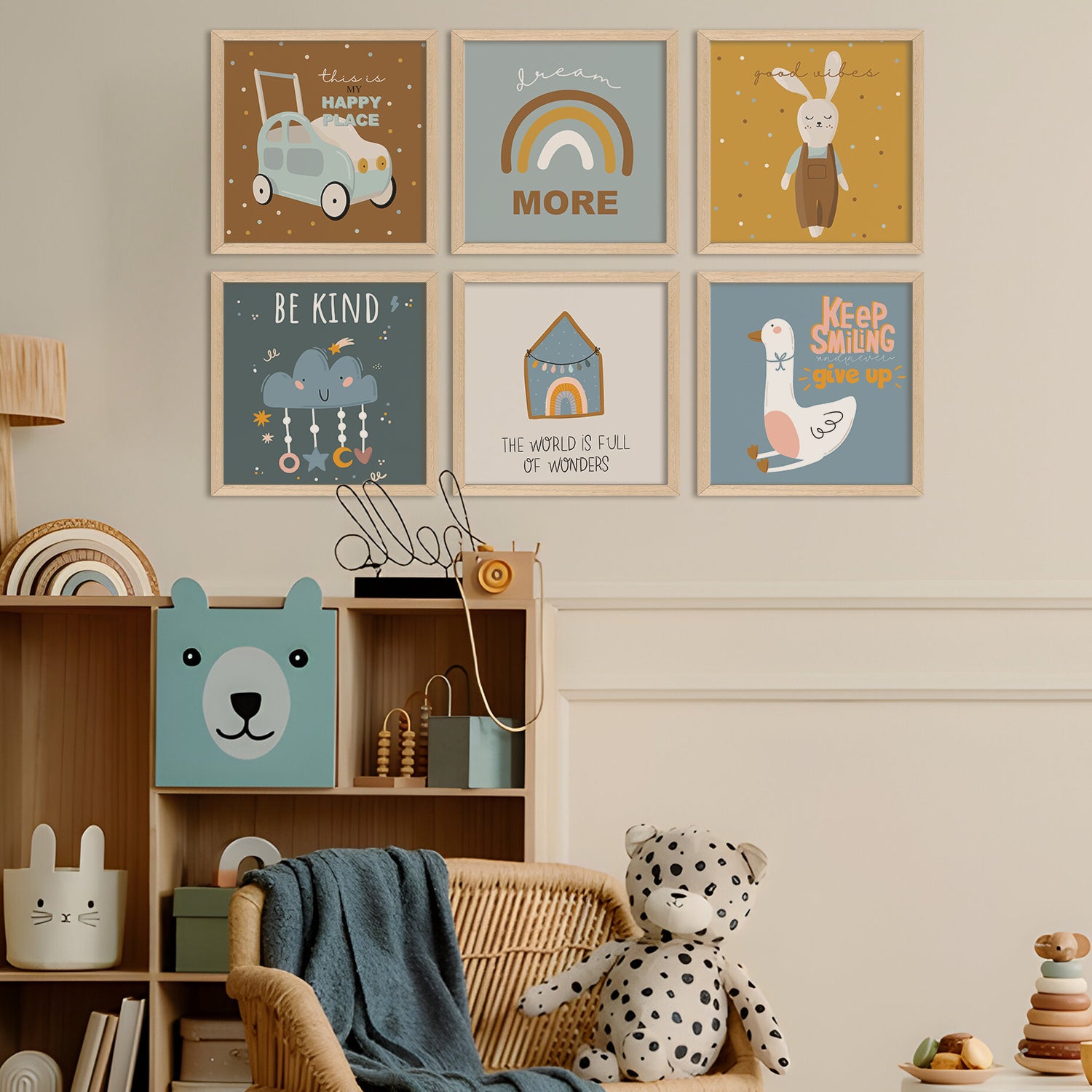 Kids Wall Art Set of 6 | HD Canvas Print | Ready to Hang | Natural Wood Panels for Nursery & Kids Room Decor | Each Frame Size: 10X10 INCH (KIDSET04)