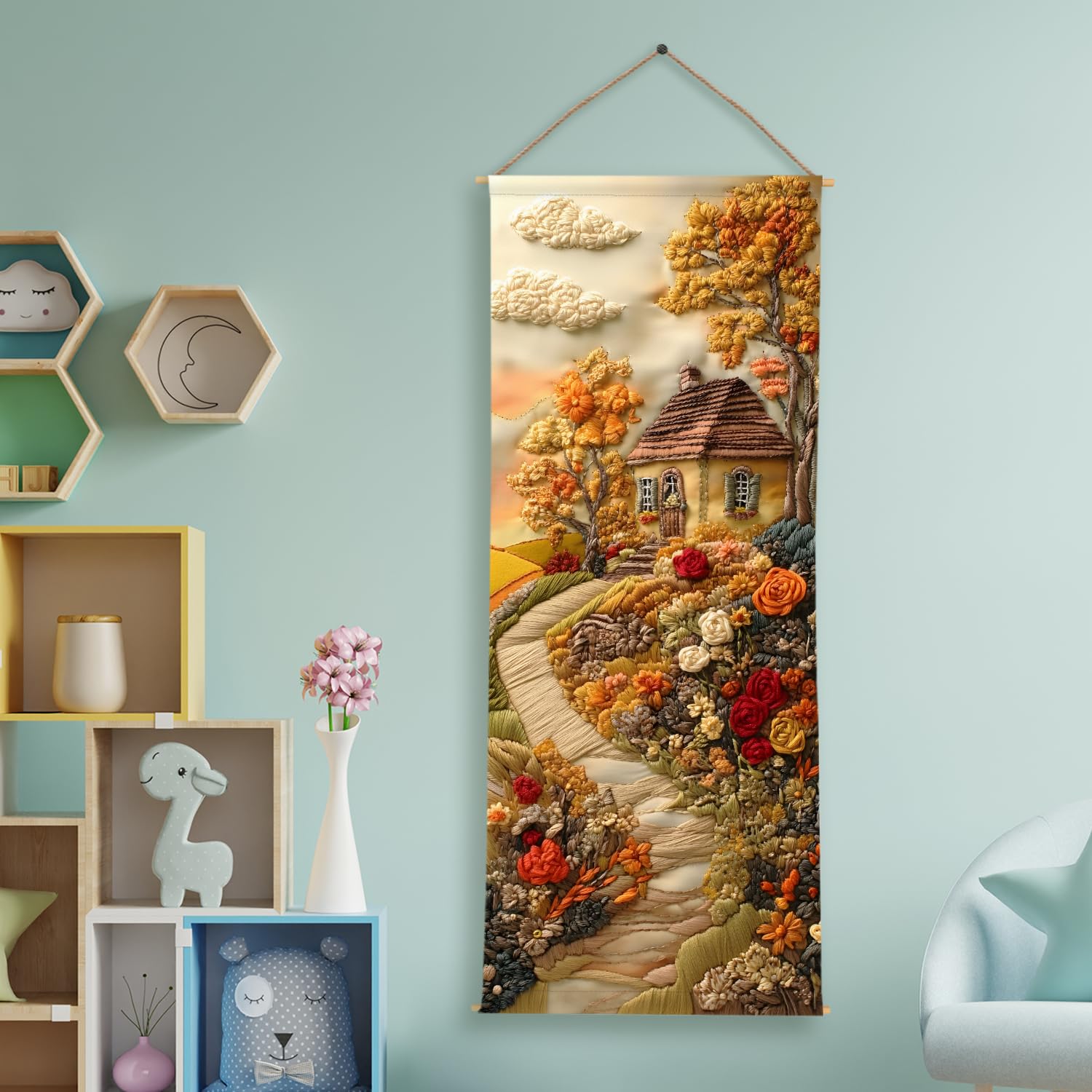 Fall House Scenic Tapestry – Rustic Autumn Wall Hanging – Decorative Wall Art for Kids room – Size: 24 x 60 Inches (KIDS02)
