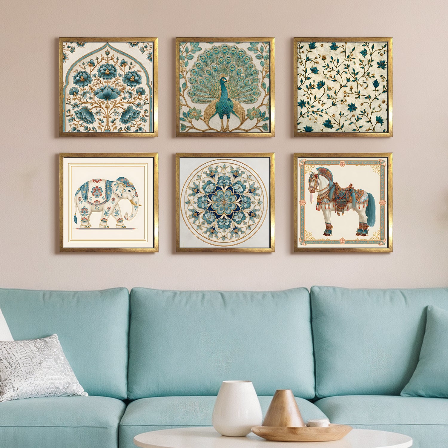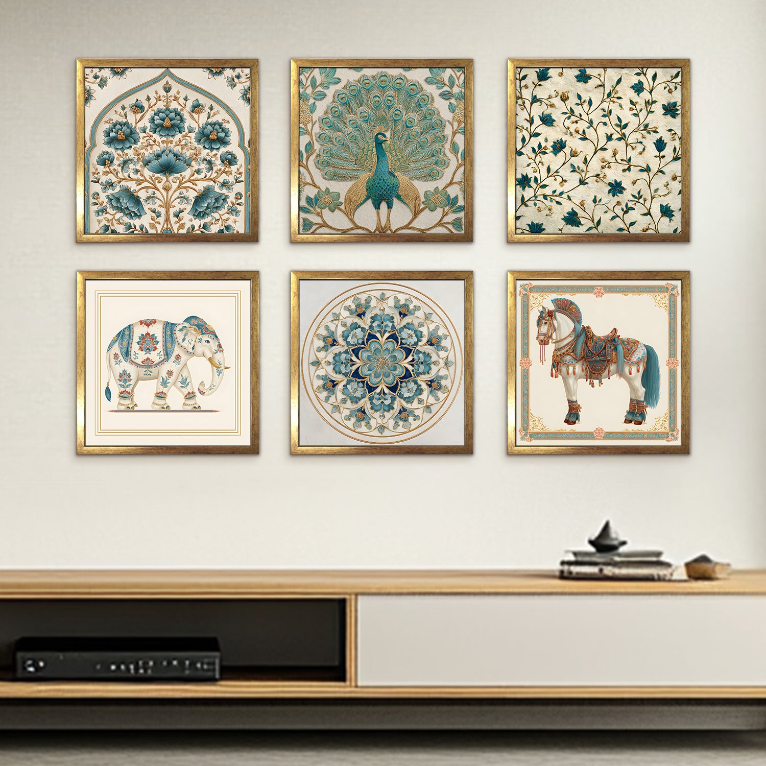 Ethnic Wall Art Set of 6 | HD Canvas Print | Ready to Hang | Golden Box Frame Panels for Home & Office Décor | Each Frame Size: 14X14 INCH (ETHF09)