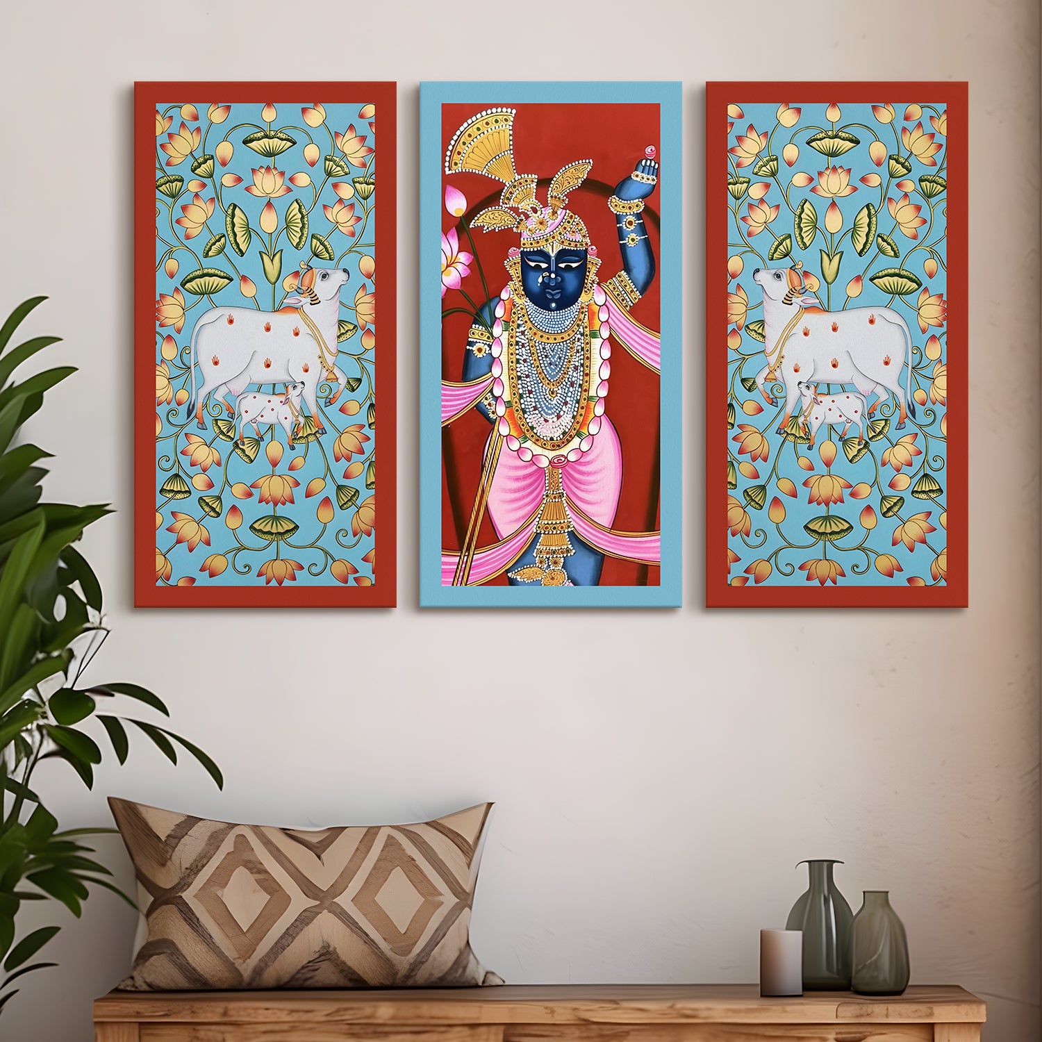 Traditional Pichwai Shreenath Ji Wall Art Set of 3 | HD Print Wrapped Canvas | Perfect for Pooja Room & Office Decor Panels |12×24 Inch (PWA34)