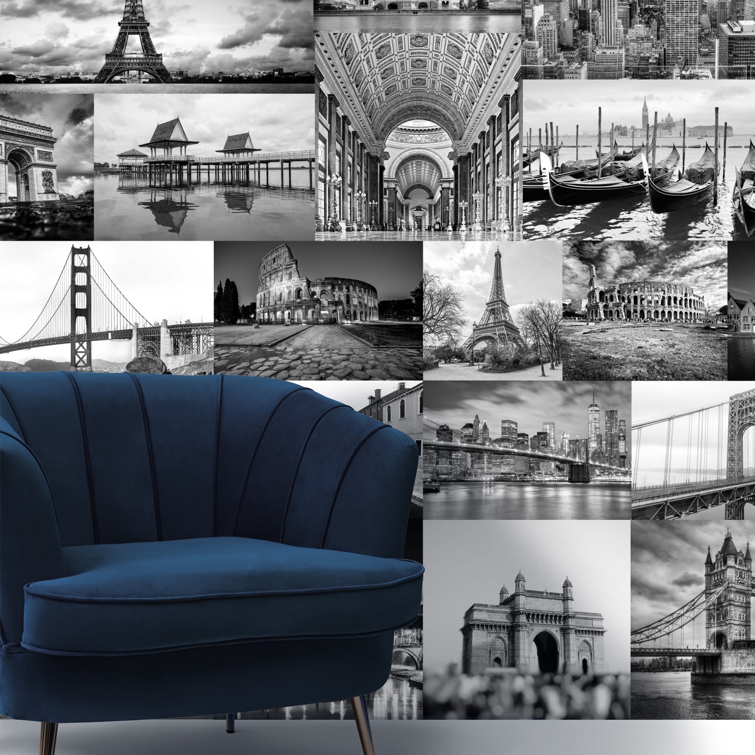 Celebrate the world’s most iconic landmarks with this elegant black-and-white cityscape collage wallpaper. Featuring timeless photographs of global wonders like the Eiffel Tower, Statue of Liberty, Colosseum, Golden Gate Bridge, and Venice canals, this mural captures the beauty of architecture and travel in a refined monochrome palette.
