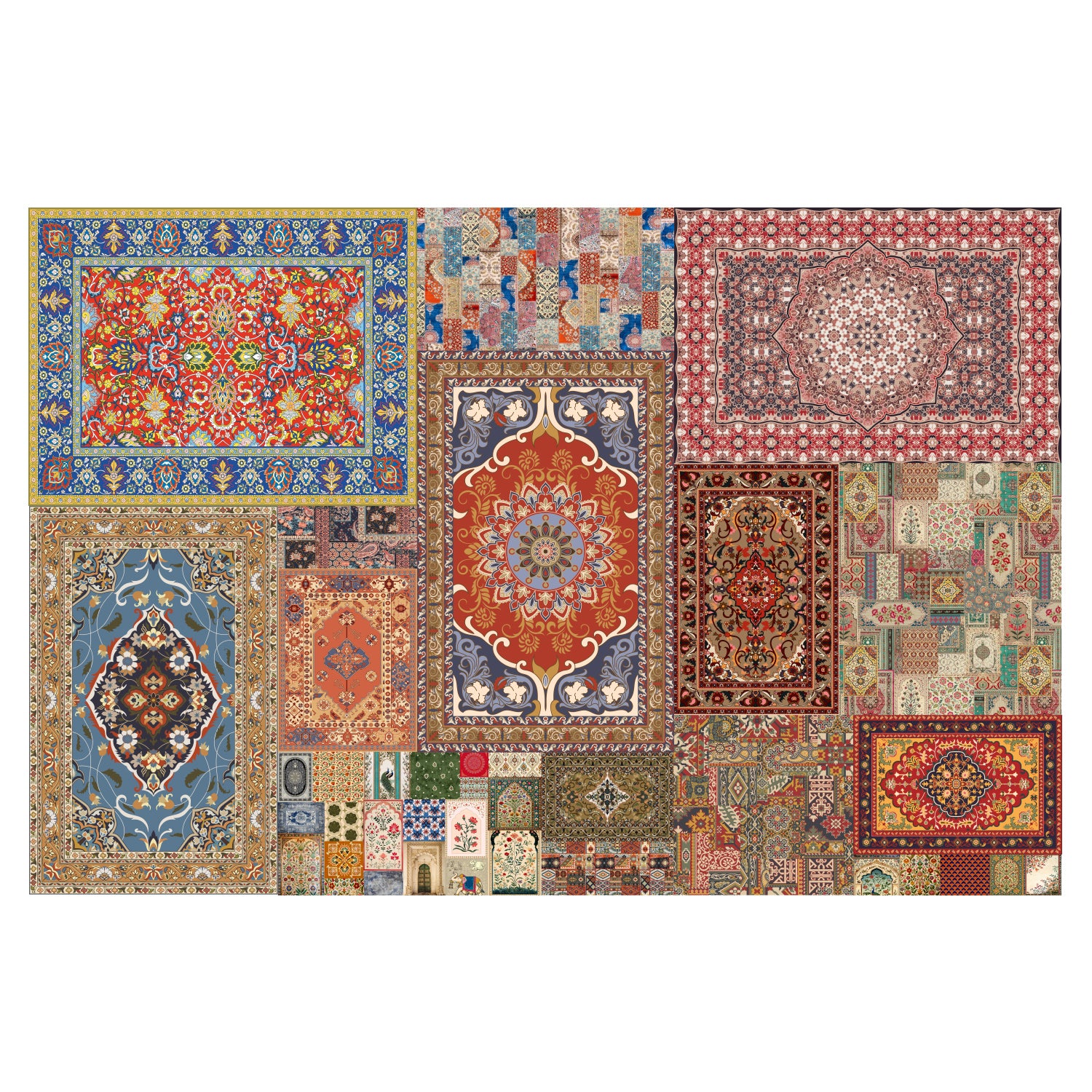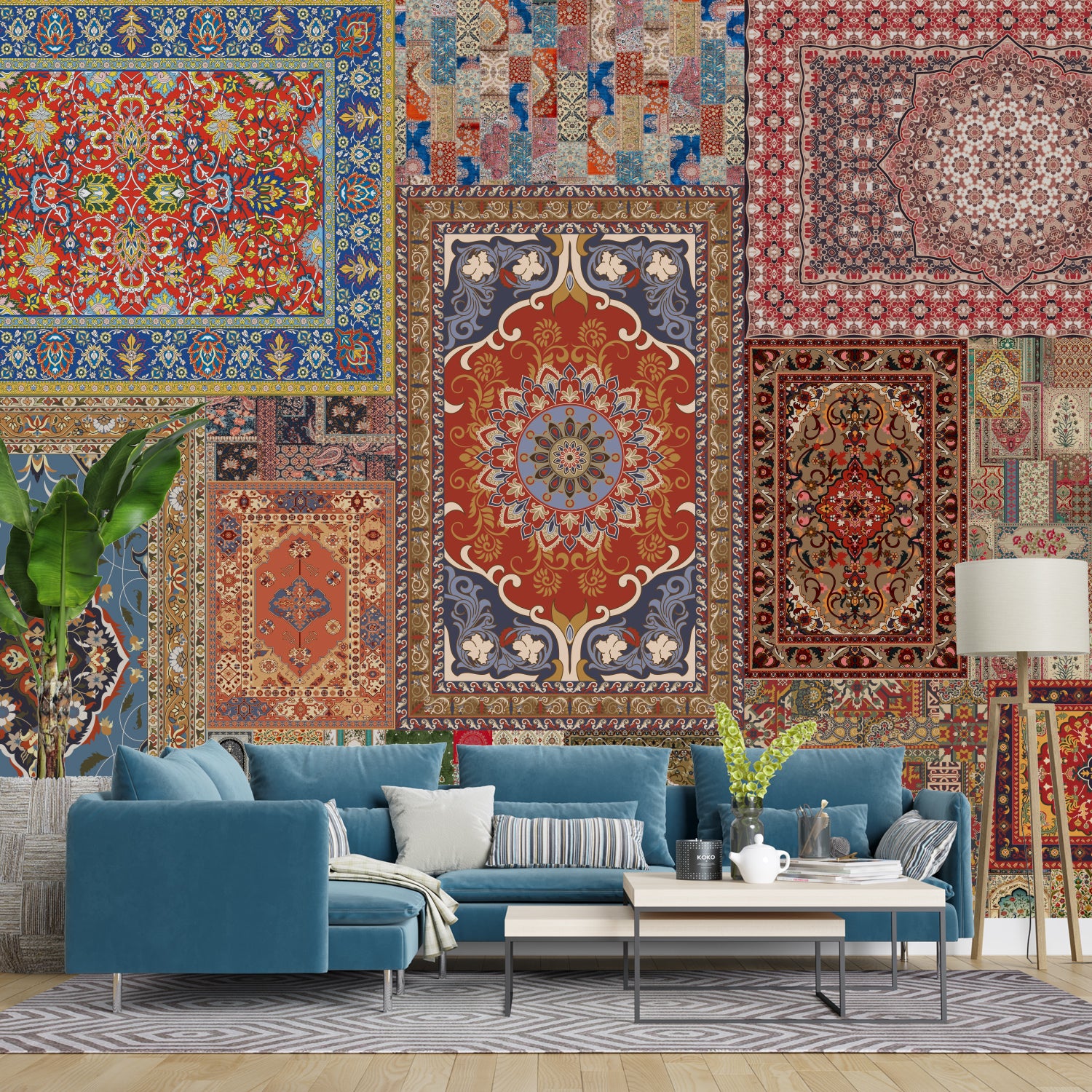 Warmth, artistry, and heritage charm to your space with this Persian-inspired patchwork wallpaper mural. Featuring an exquisite collage of vintage carpet motifs, ornate tiles, and oriental patterns, this design celebrates the craftsmanship of handwoven rugs from India, Persia, and beyond.
