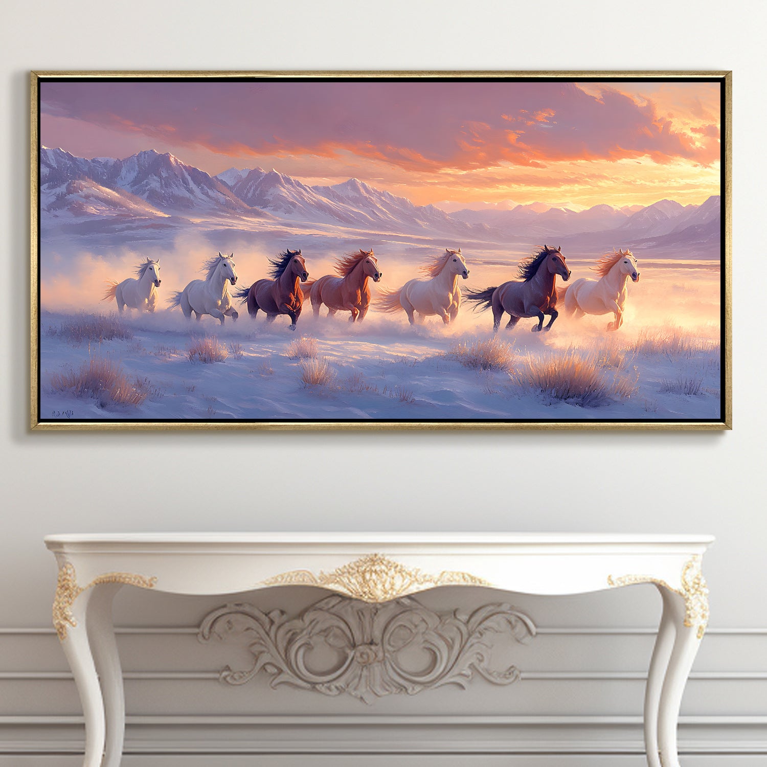 Seven Running Horses Wall Painting – Symbol of Prosperity, Success & Positive Energy | Premium Vastu Artwork for Home & Office Decor | Luxury Golden Floating Frame HD Canvas Print ( 24 Inch x 48 Inch ) (VAWA45).