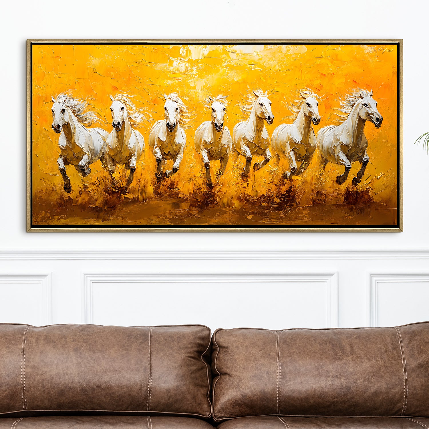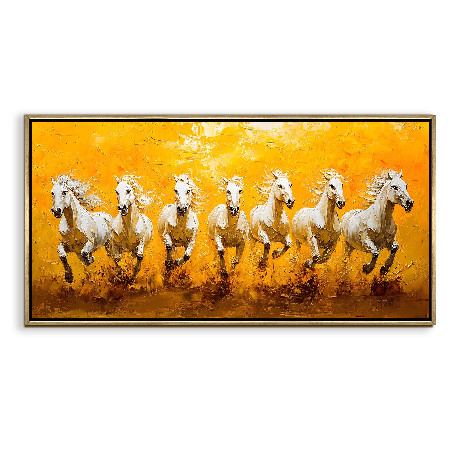 Seven Running Horses Wall Painting – Symbol of Prosperity, Success & Positive Energy | Premium Vastu Artwork for Home & Office Decor | Luxury Golden Floating Frame HD Canvas Print ( 24 Inch x 48 Inch ) (VAWA55)