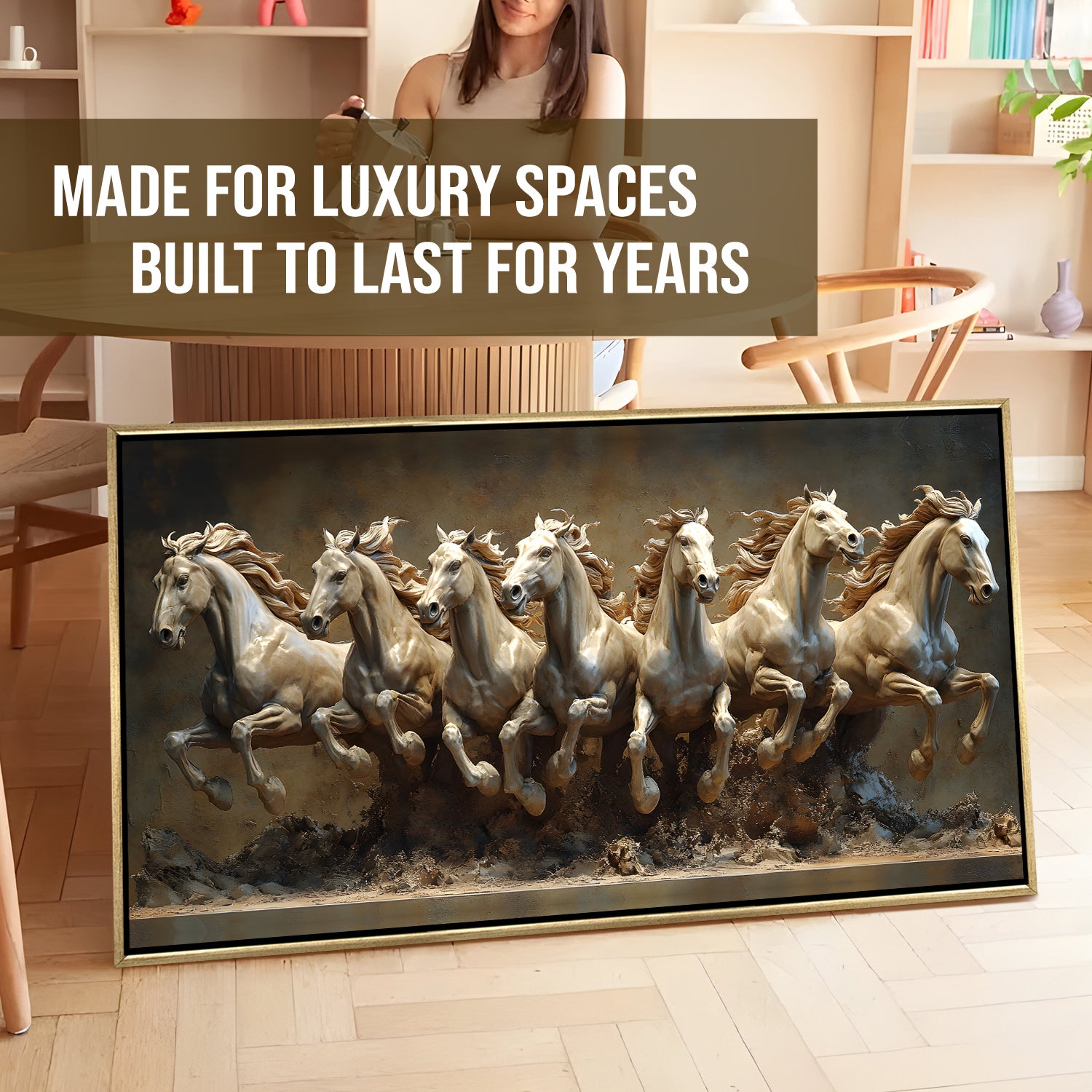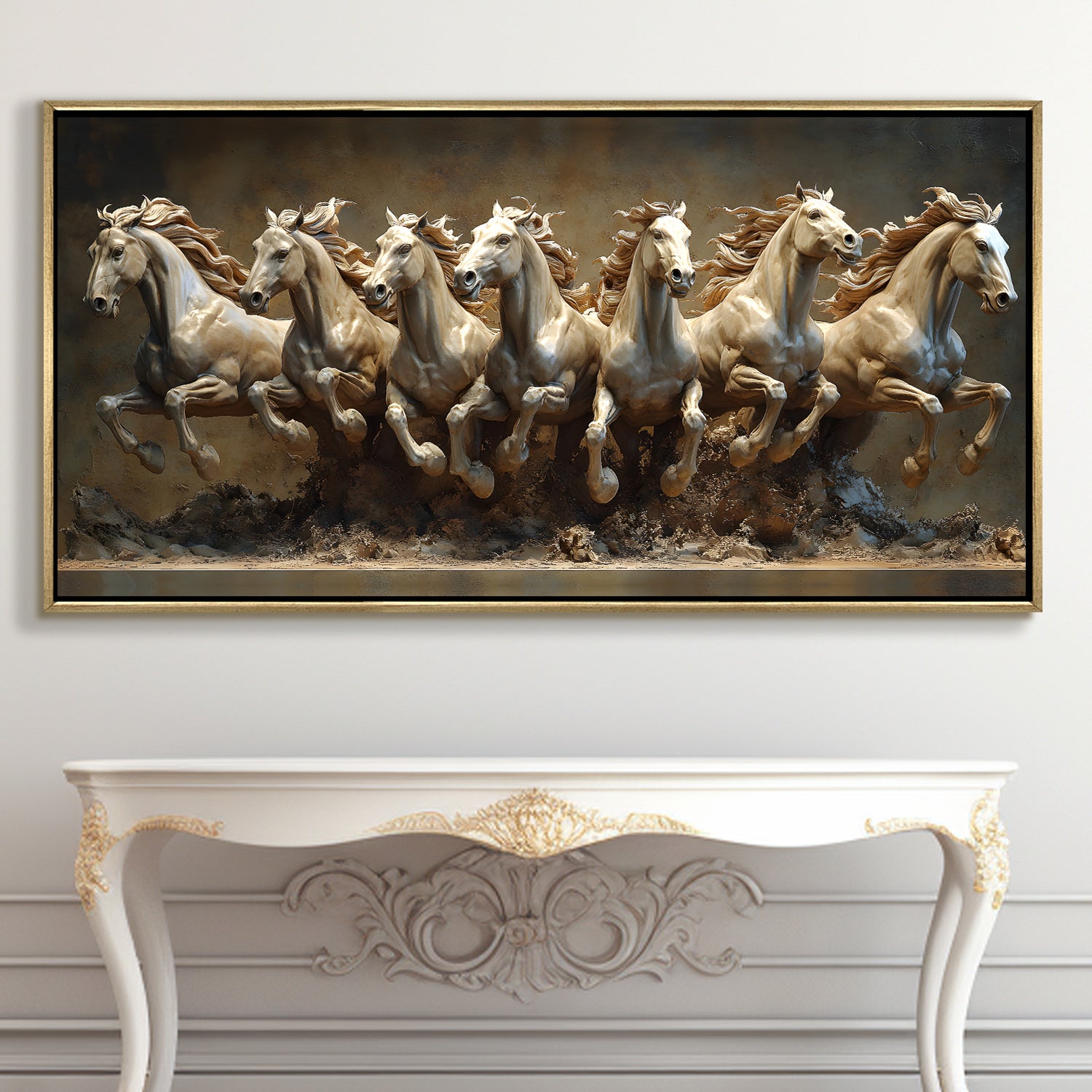Seven Running Horses Wall Painting – Symbol of Prosperity, Success & Positive Energy | Premium Vastu Artwork for Home & Office Decor | Luxury Golden Floating Frame HD Canvas Print ( 24 Inch x 48 Inch ) (VAWA63)