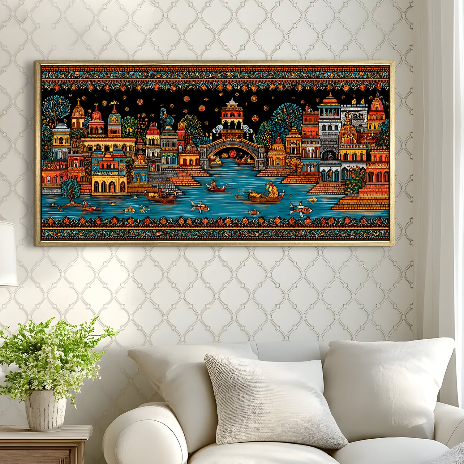- Authentic Indian Heritage Art – Stunning painting of Varanasi Ghats showcasing temples, boats, and river life in vibrant colors.