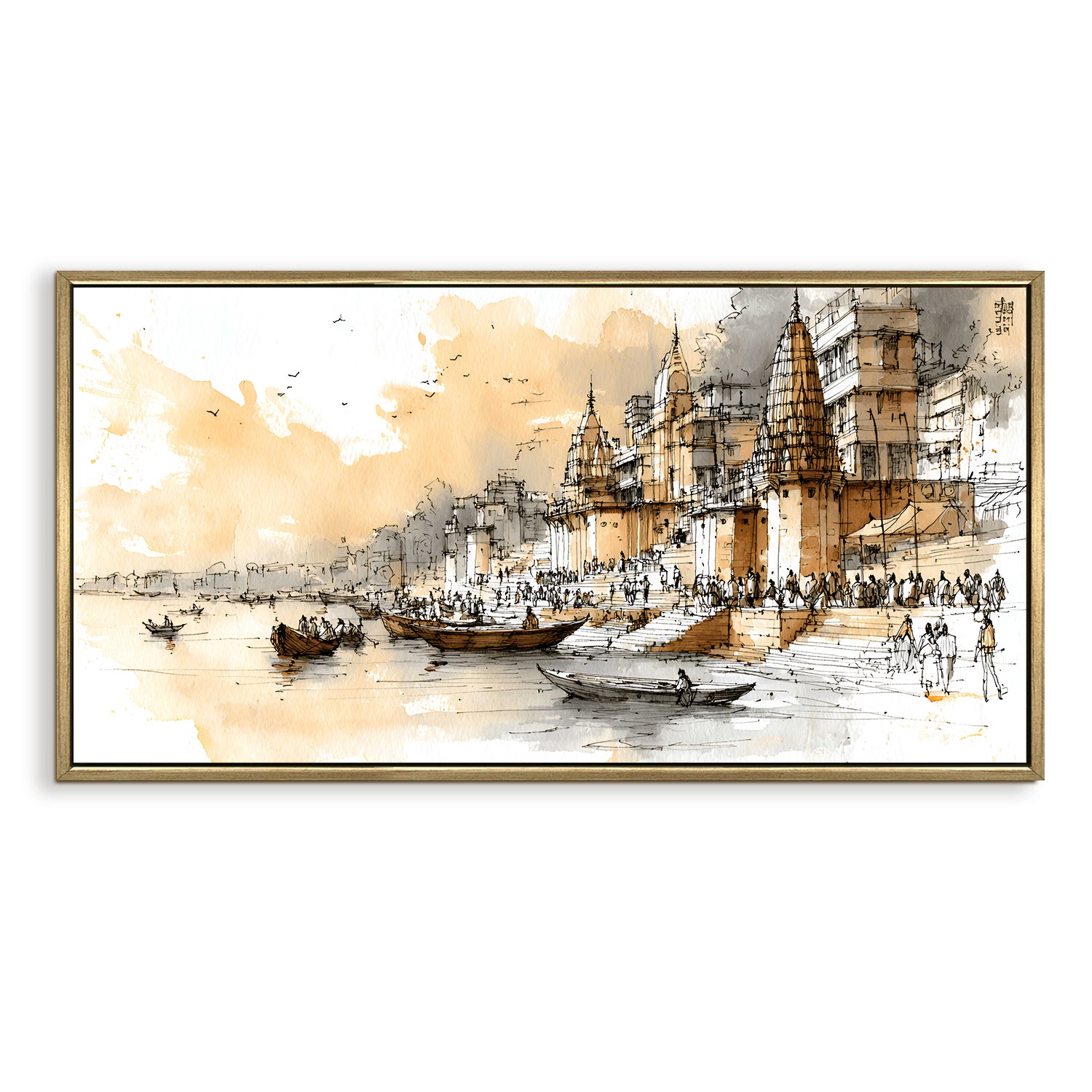 Banaras Ghats Painting Wall Art – Varanasi Riverfront with Golden Floater Frame – HD Print Large Canvas, Ready to Hang, Size: 2X4FT, (BAWA41).