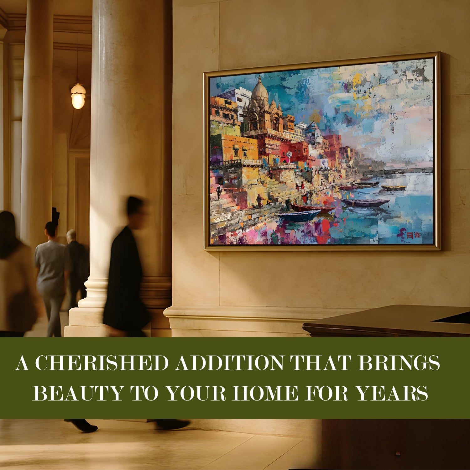Banaras Ghats Painting Wall Art – Varanasi Riverfront with Golden Floater Frame – HD Print Large Canvas, Ready to Hang, Size: 3X4FT, (BAWA02).
