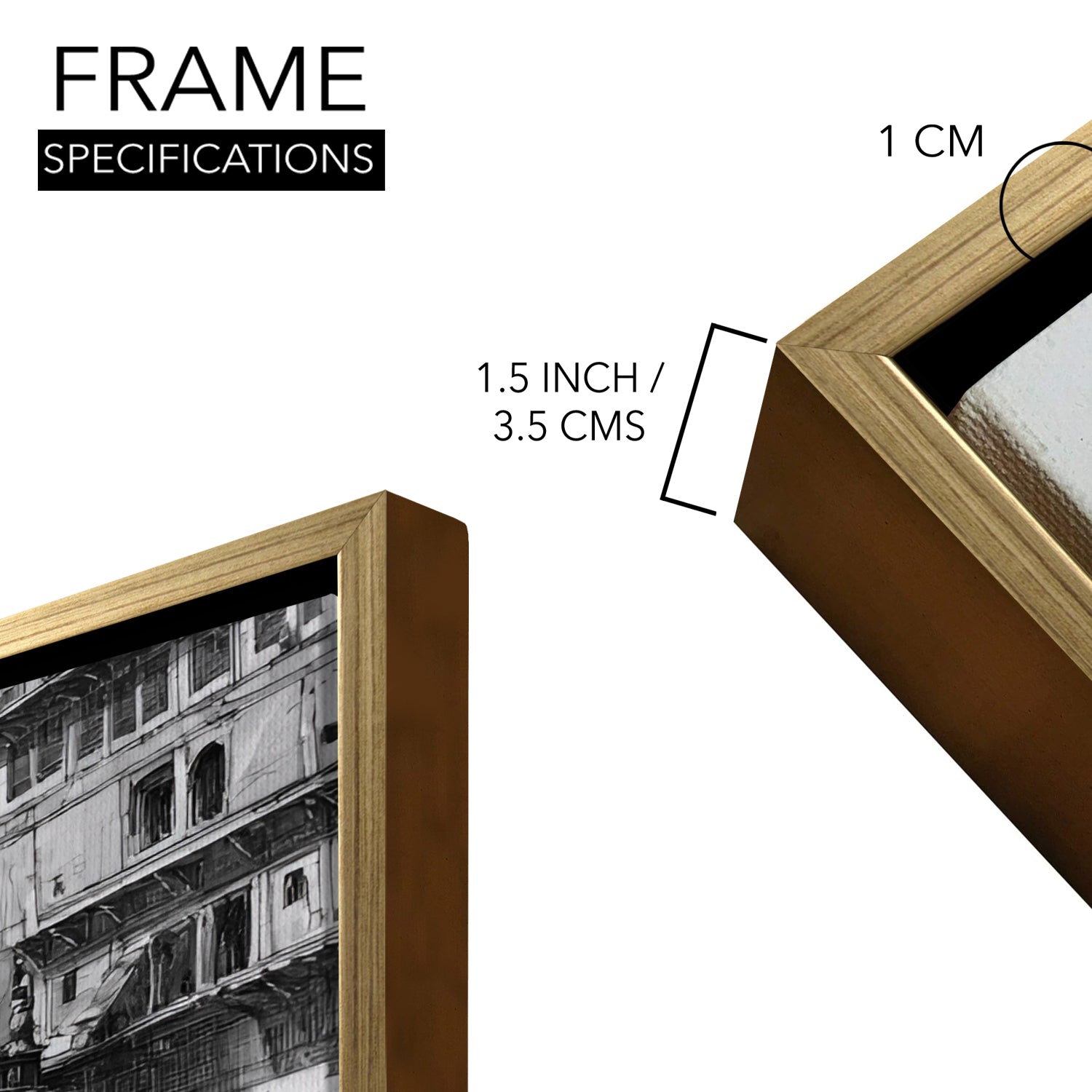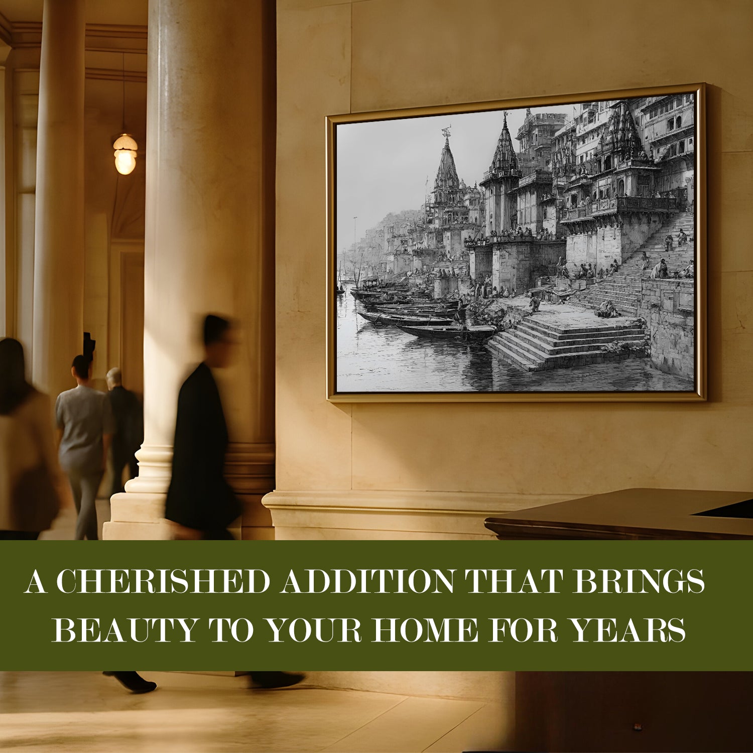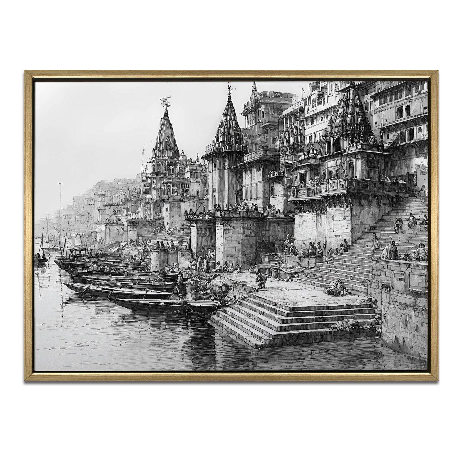 Banaras Ghats Painting Wall Art – Varanasi Riverfront with Golden Floater Frame – HD Print Large Canvas, Ready to Hang, Size: 3X4FT, (BAWA06).