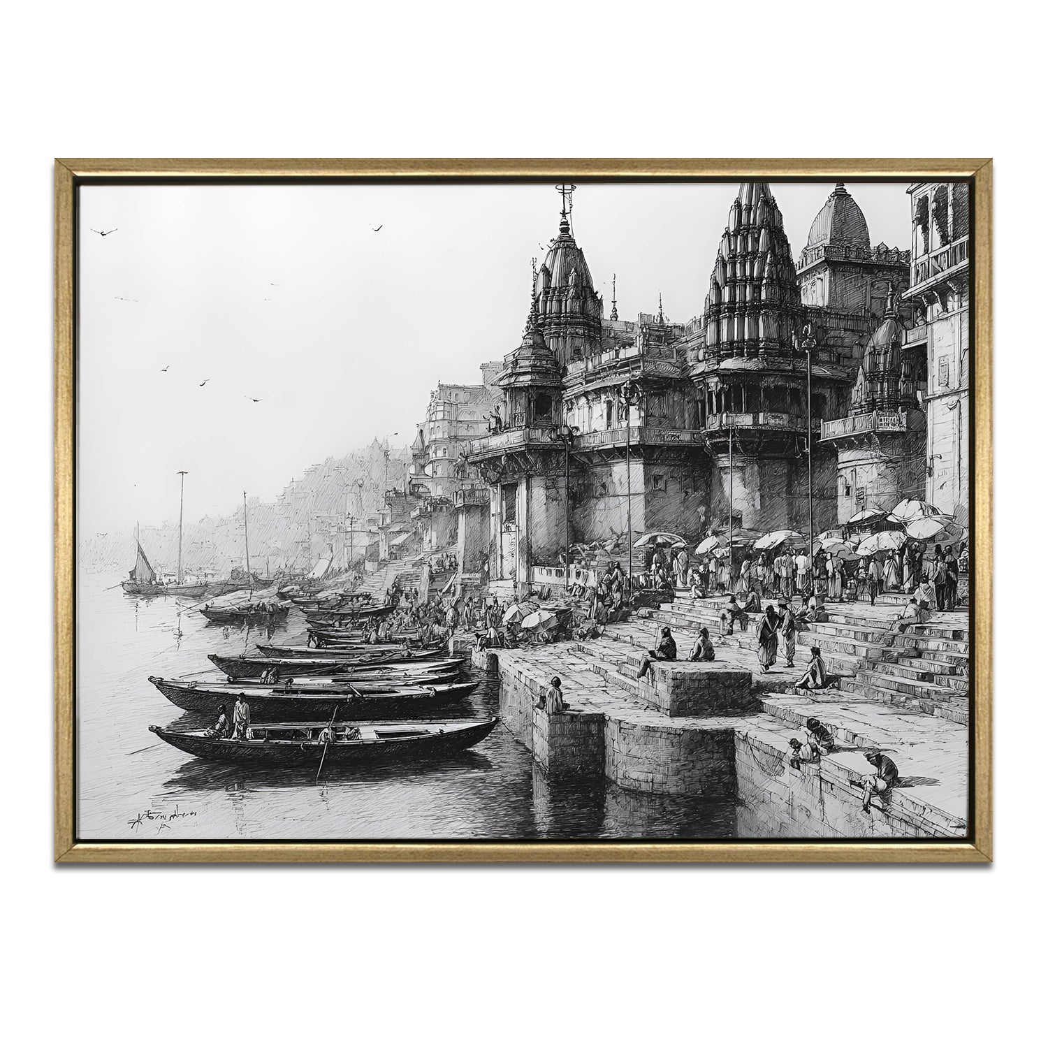 Banaras Ghats Painting Wall Art – Varanasi Riverfront with Golden Floater Frame – HD Print Large Canvas, Ready to Hang, Size: 3X4FT, (BAWA18).