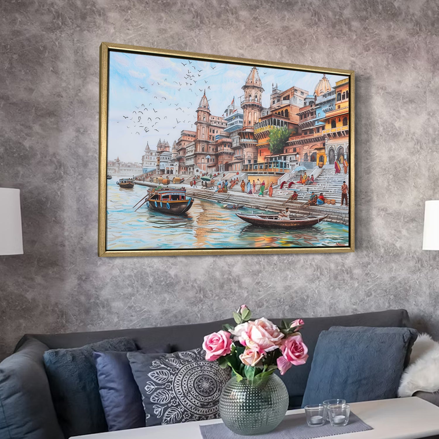 - Authentic Indian Heritage Art – Stunning painting of Varanasi Ghats showcasing temples, boats, and river life in vibrant colors.