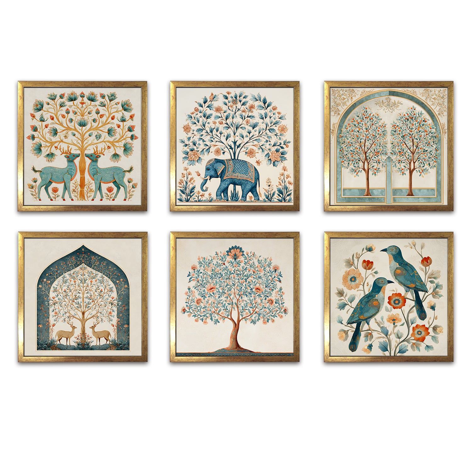Ethnic Wall Art Set of 6 | HD Canvas Print | Ready to Hang | Golden Box Frame Panels for Home & Office Décor | Each Frame Size: 14X14 INCH (ETHF06)