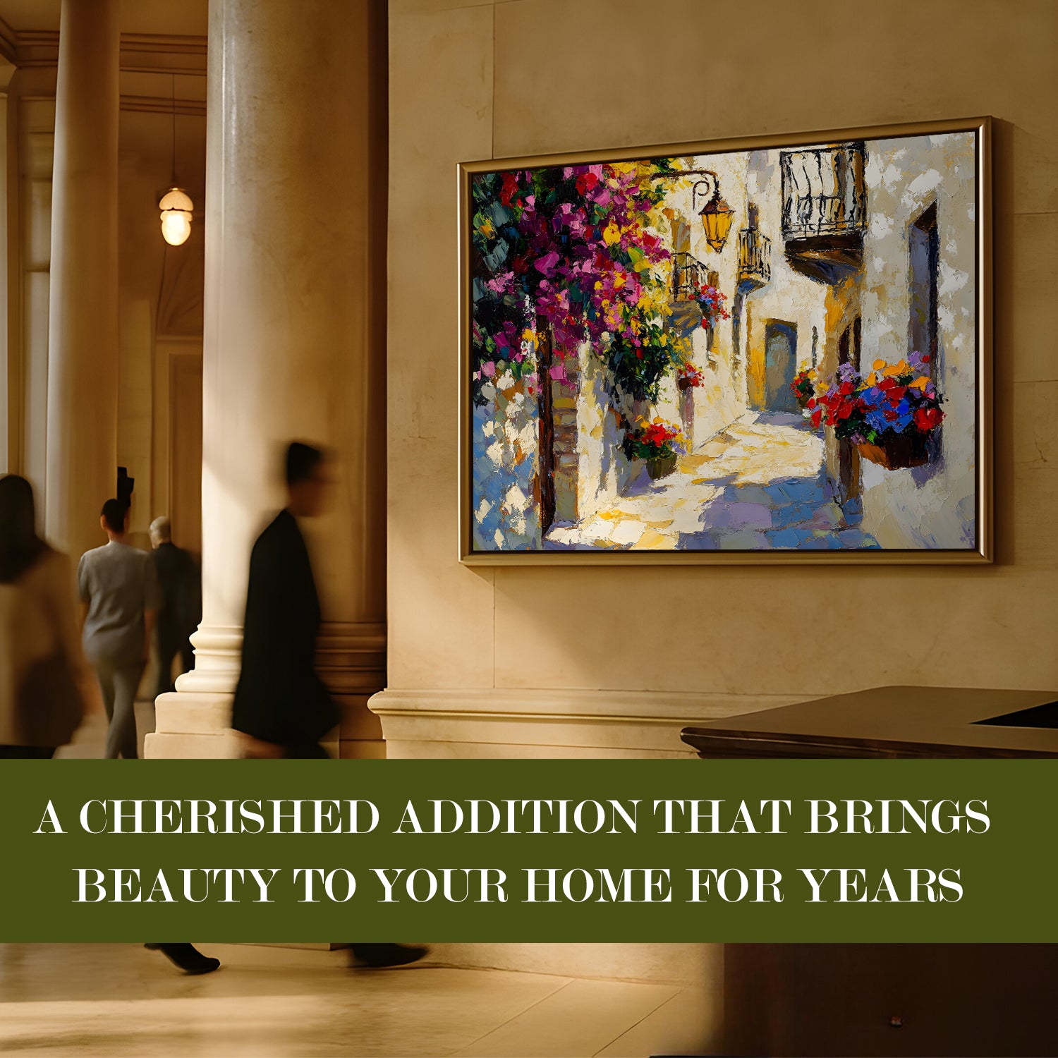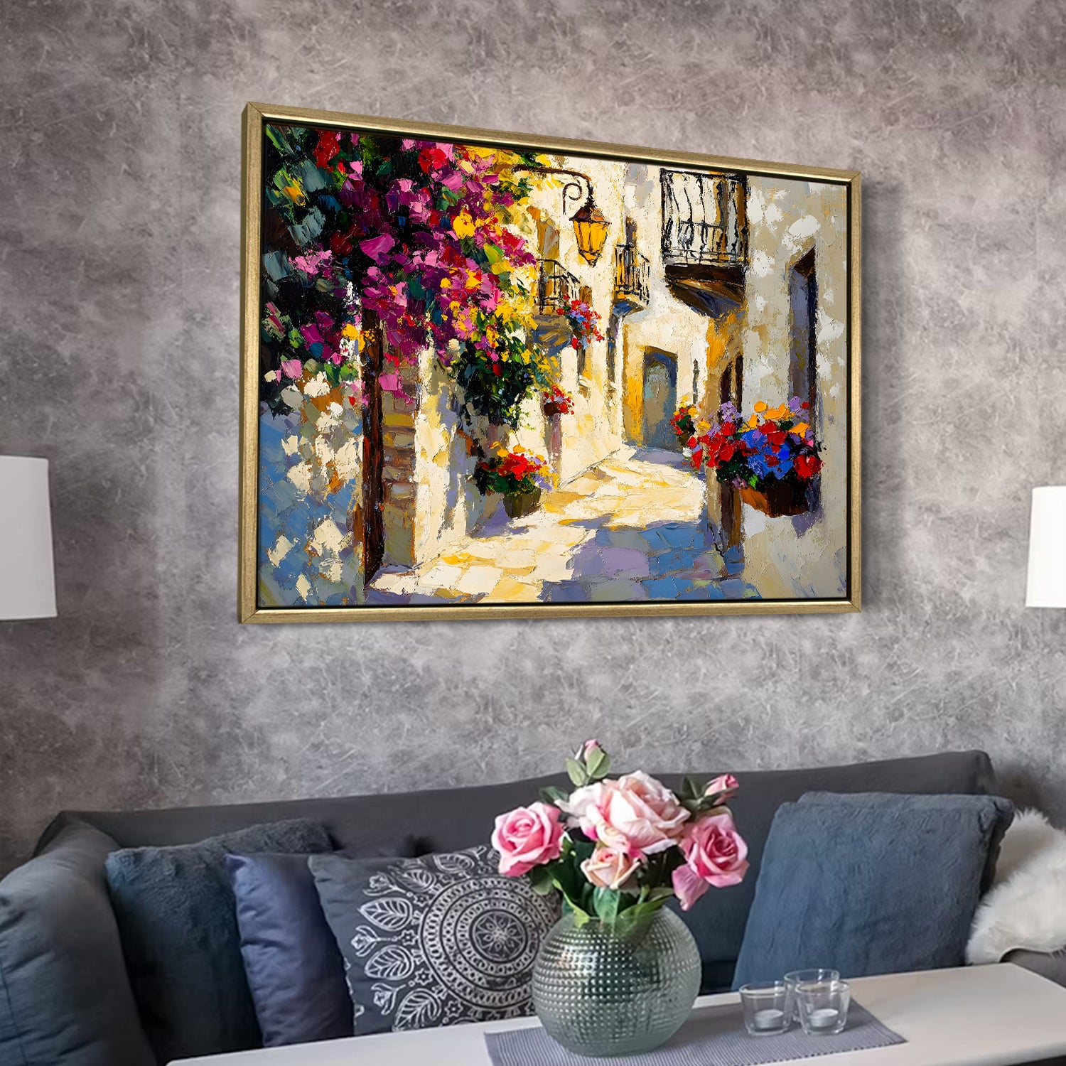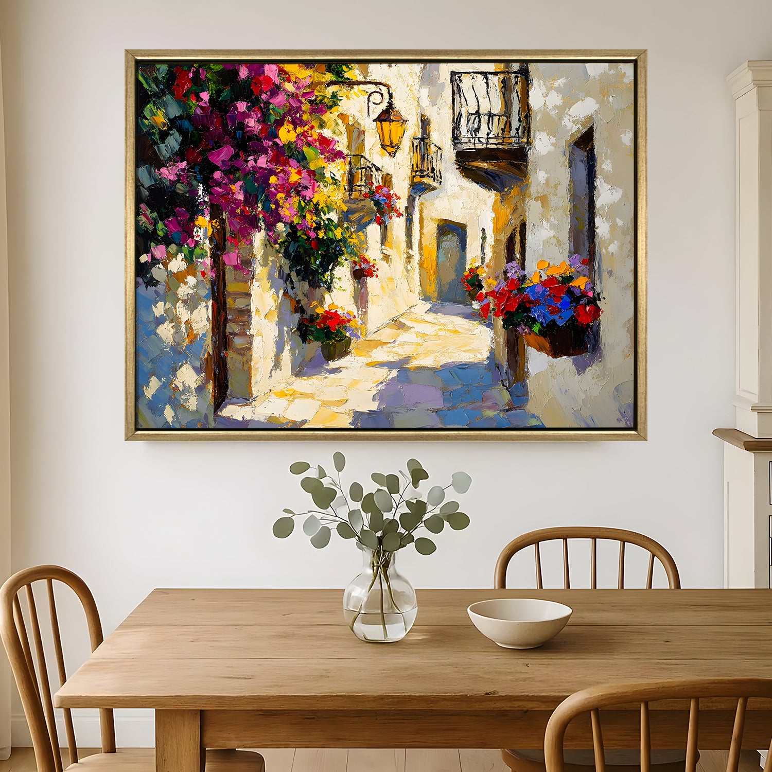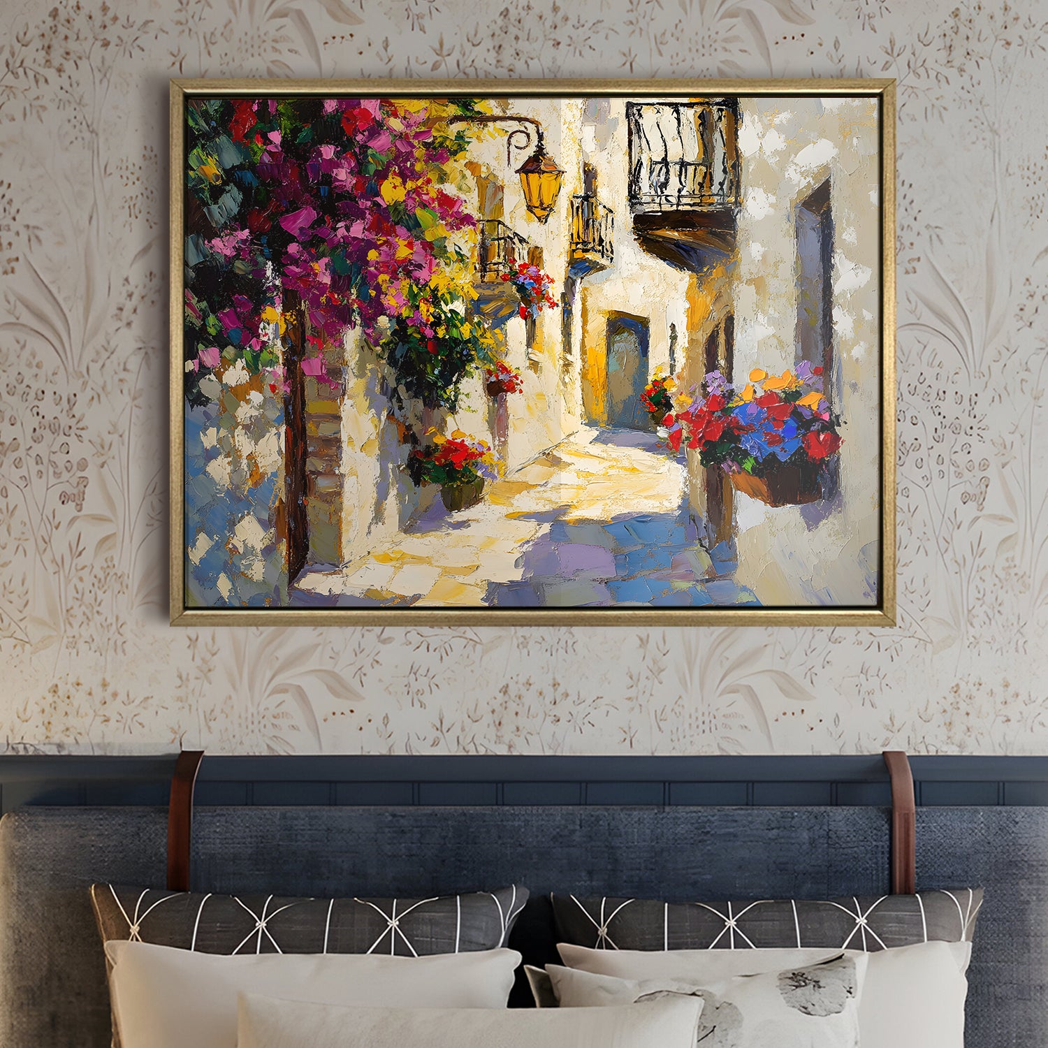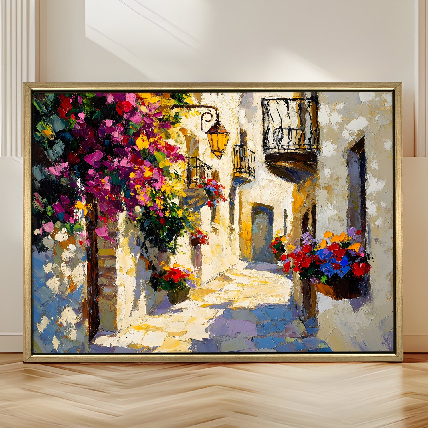 Narrow alley with balconies full of flowers Wall Art, HD Canvas Print, Golden Floater Framed, Ready to Hang, (36 In x 48 In) (CITY-WA-07)